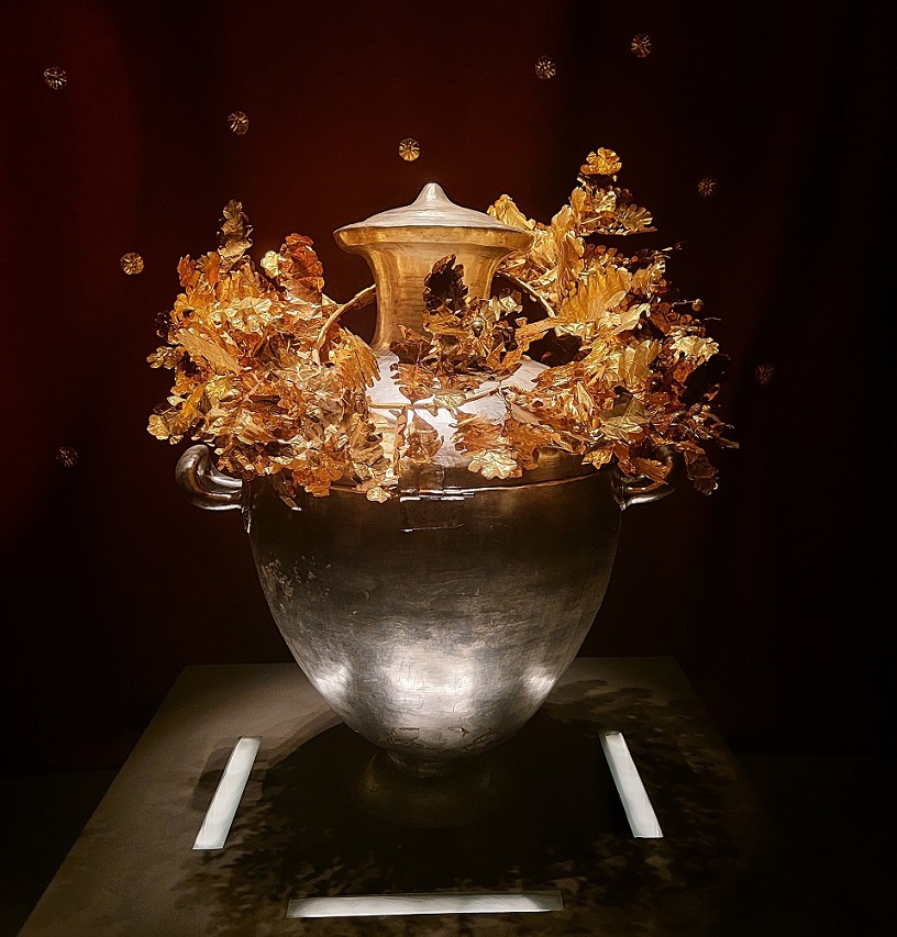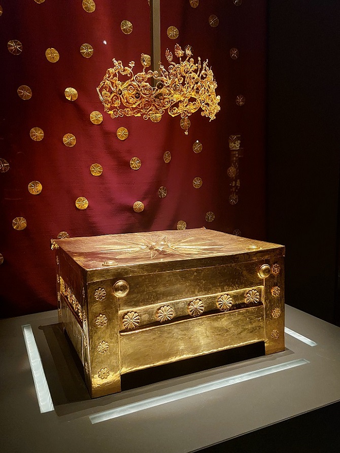 Y más fotos de los tesoros descubiertos en el interior de la tumba II. A la izquierda, corona y urna funeraria, ambos de oro macizo, encontrados en la antecámara de la tumba. A la derecha, corona y urna, también de oro, encontrados en la cámara principal. Ambas urnas contenían los restos incinerados de dos personas.
