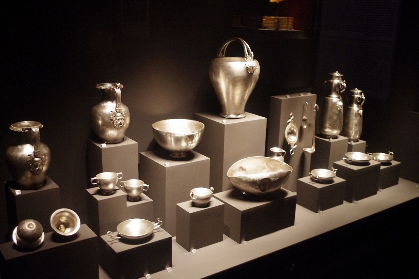 Arriba, una vajilla de plata en perfectas condiciones de conservación y un adorno tallado en madera. Abajo, dos imágenes de la armadura y escudo ceremoniales, con incrustaciones de oro y marfil, encontrados en la tumba II y que casi con seguridad pertenecieron al rey Filipo II.