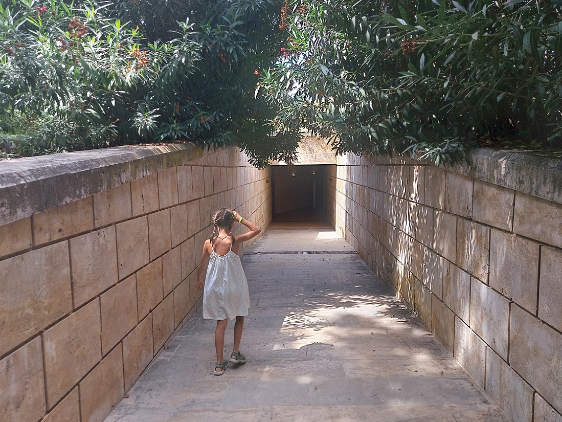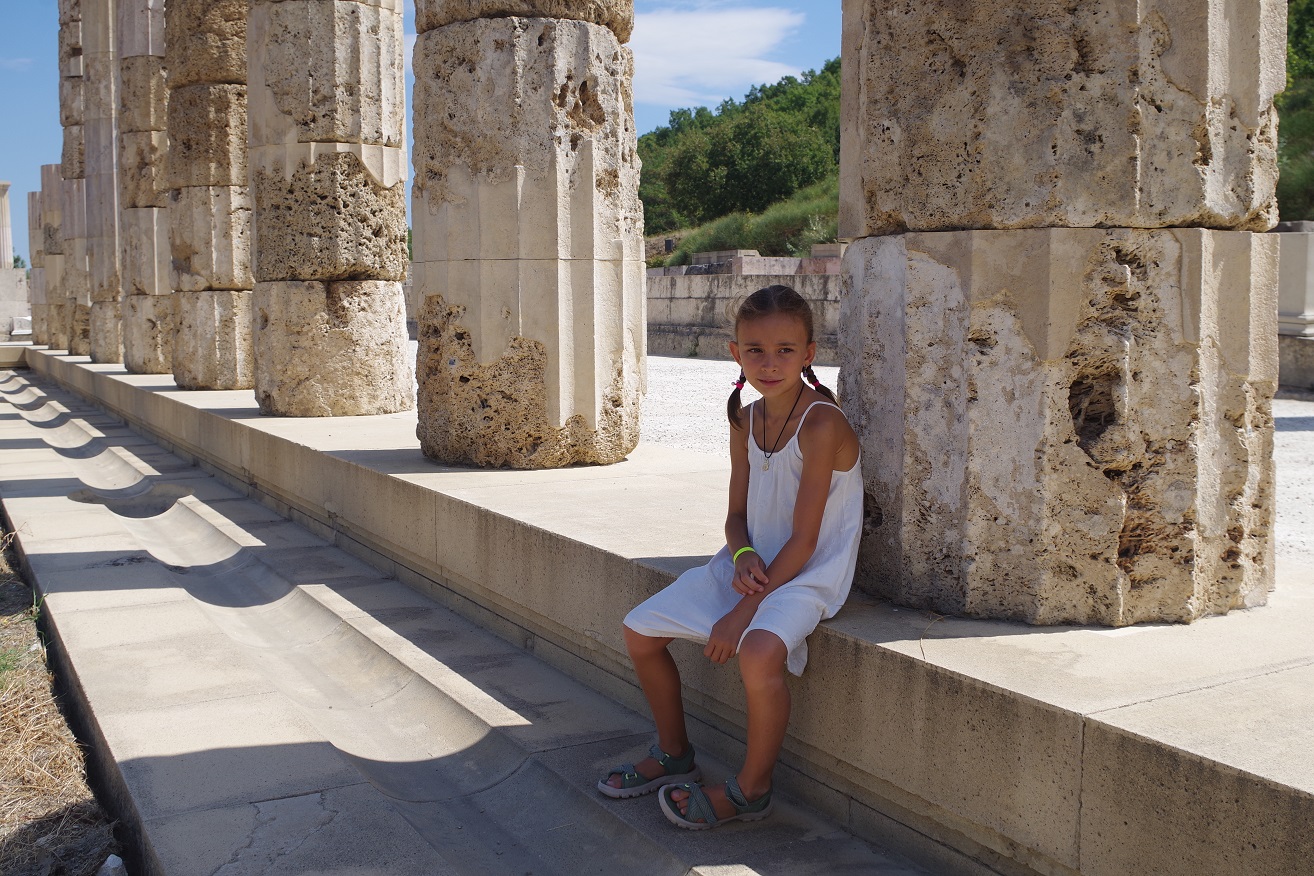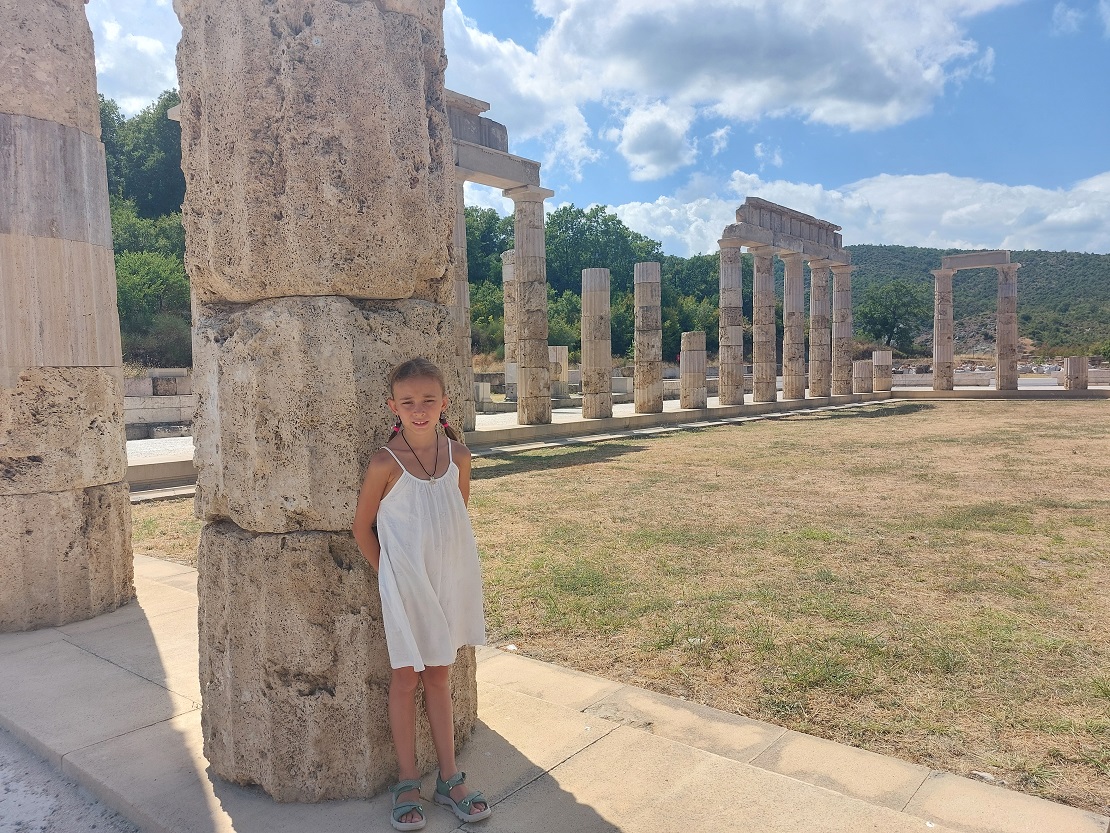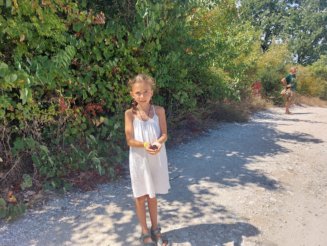 El camino, a esas horas y con calor, se hace un poco largo, la verdad. Por el camino pasamos por los restos del pequeño teatro donde fue asesinado el rey Filipo II por Pausanias, un miembro de su guardia personal, durante la boda de su hija Cleopatra. Nunca se supo exactamente por qué lo había hecho, ya que fue inmediatamente ejecutado, antes de que nadie pudiera preguntarle. Del teatro no queda nada, ni una piedra casi, tan solo la huella que ha dejado en el terreno. Por suerte, de camino había algunas zarzas con moras, que consiguieron distraer un poco a Inés de ese absurdo paseo justo a la hora de comer. Abajo, un par de fotos del paseo.