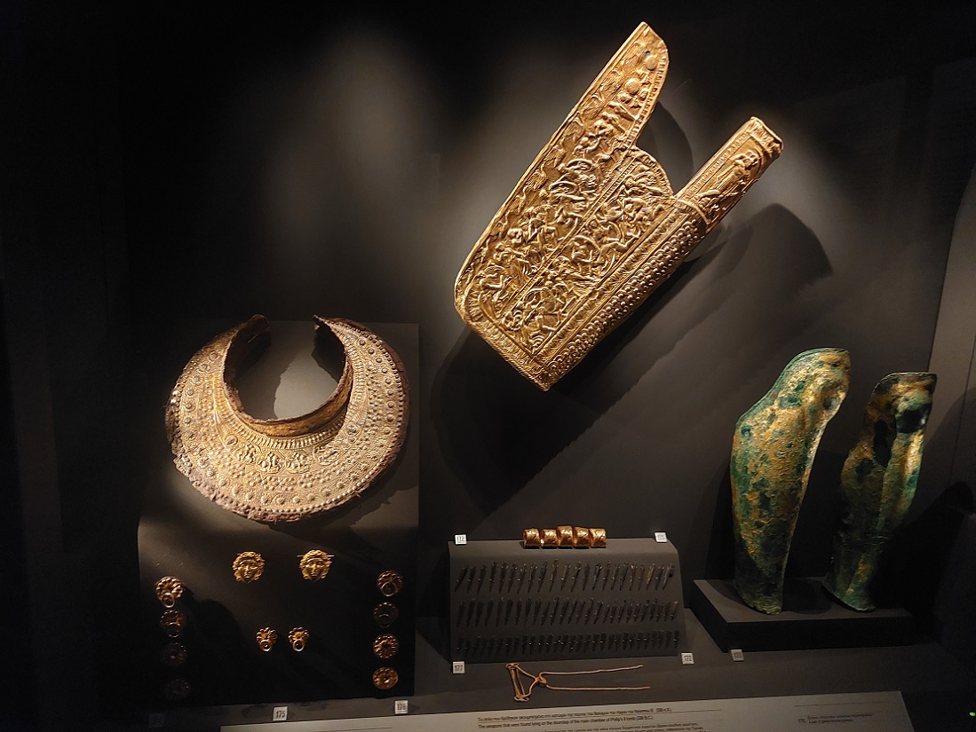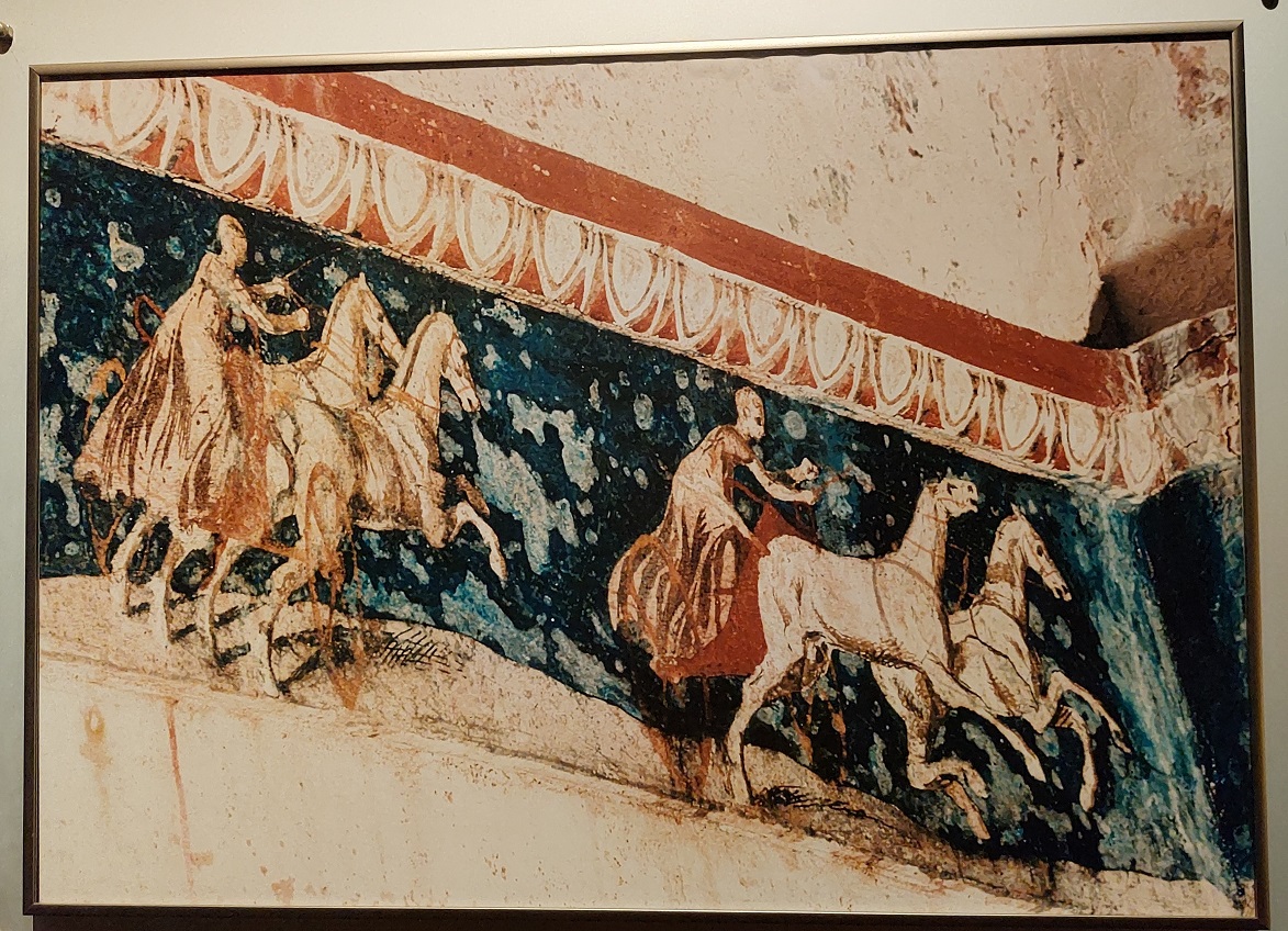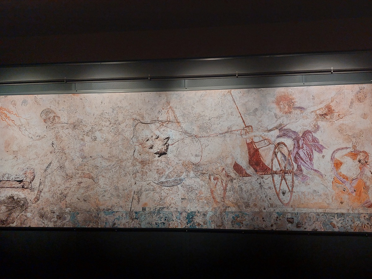Abajo a la izquierda, una foto expuesta en el museo que muestra parte de los frescos de la tumba III, donde aparece una carrera de carros. En la otra foto, una urna de plata (tumba III también) en la que se encontraron las cenizas de una persona, y encima una corona de oro. Se piensa que las cenizas correspondían a Alejandro IV, hijo de Alejandro Magno, que fue asesinado siendo adolescente.