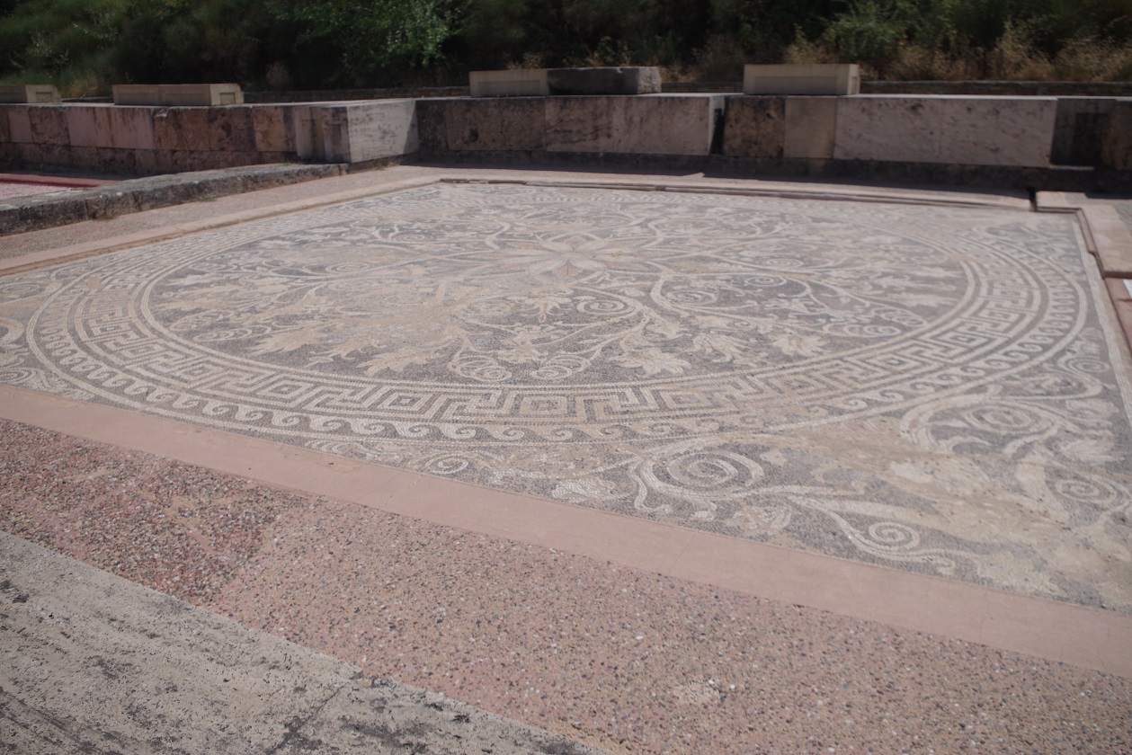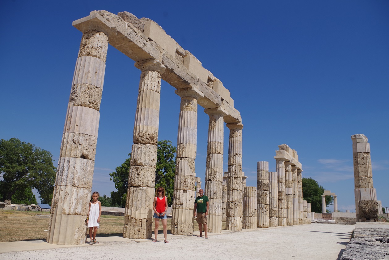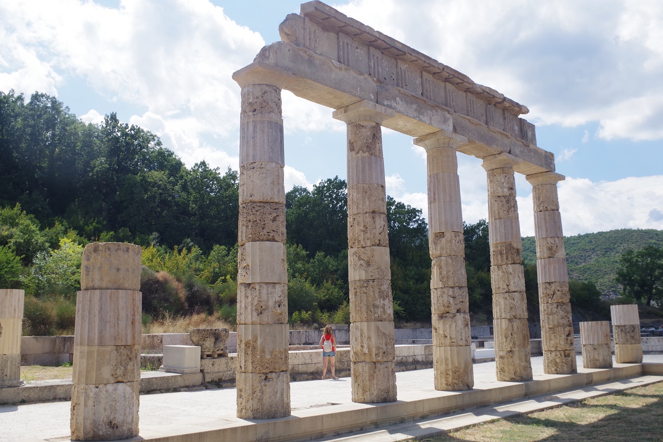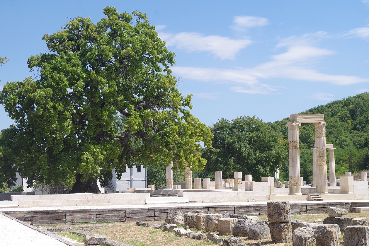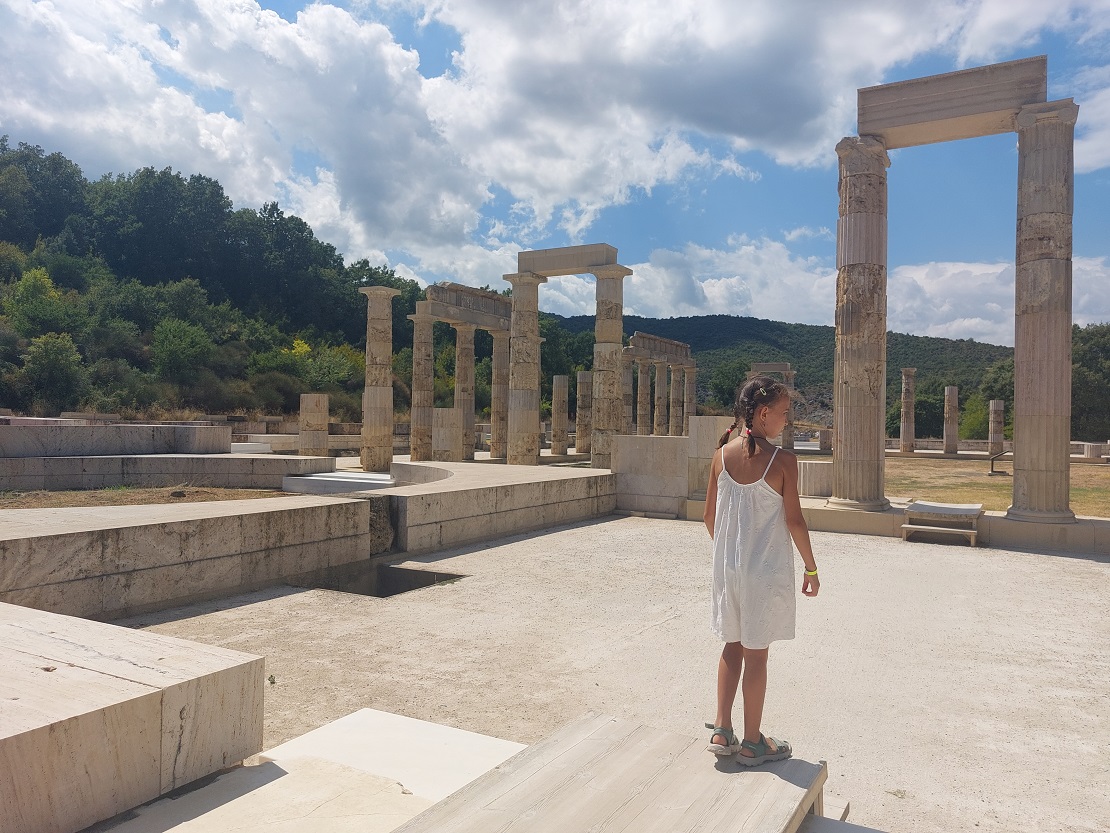 Junto a la entrada de las ruinas hay un enorme roble centenario, tan espectacular como los restos del palacio. Este palacio fue destruído por el ejército romano en el año 168 a.C en su campaña de conquista de Grecia, y nunca volvió a ser completamente restaurado. Tiempo después, sobre sus ruinas se construyó una iglesia, que fue desmontada durante la reconstrucción del palacio. Es increíble pensar que por estos patios podría corretear Alejandro Magno cuando era un chaval de 13 años, y recibía clases de su maestro Aristóteles.