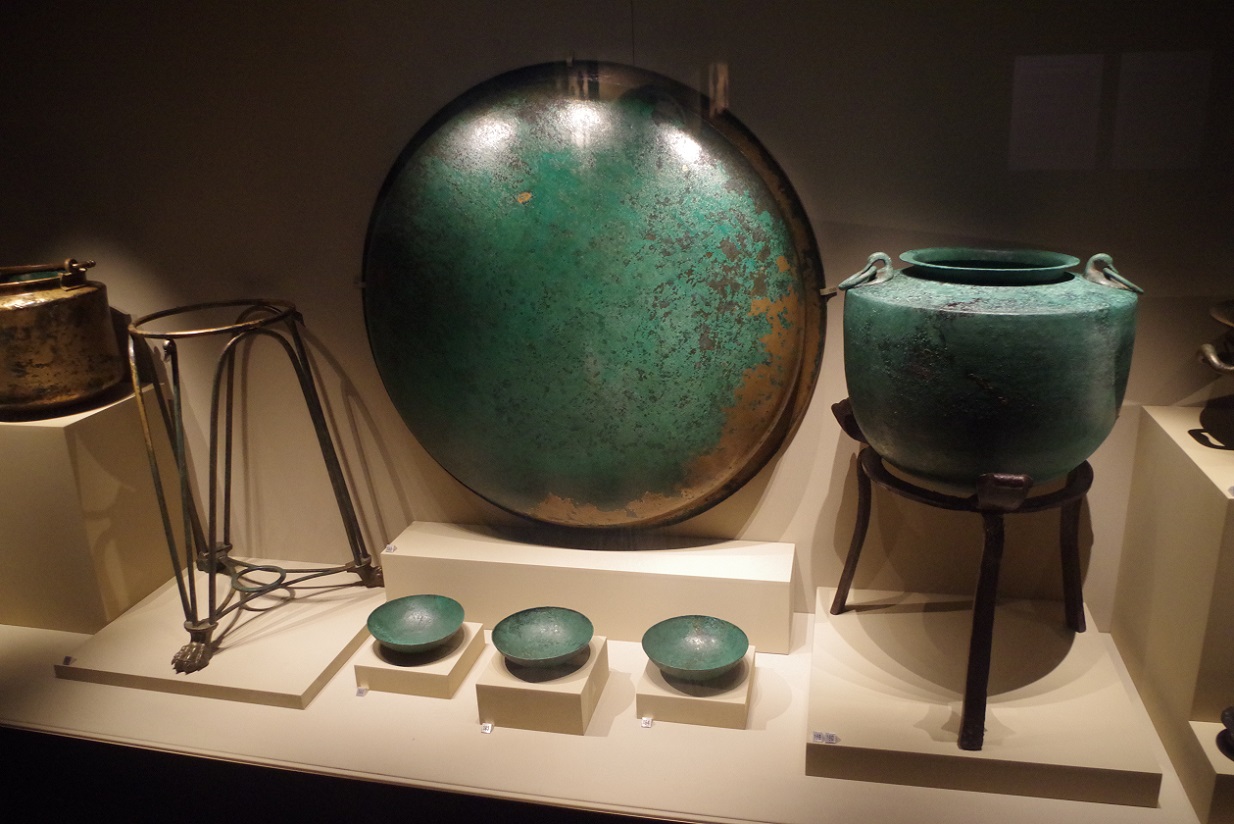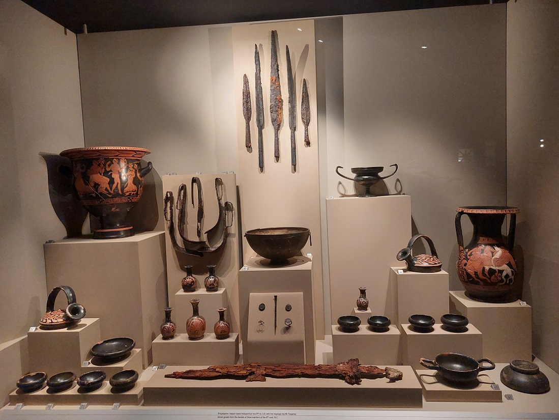 Nosotros íbamos pensando que no podríamos hacer fotos (con lo que nos gusta), ya que en internet se dice en todos sitios que está absolutamente prohibido hacer fotos. Bueno, quizá lo estuvo antes, pero ahora, en Agosto de 2025, se puede hacer fotos libremente, todas las que veis en este artículo las hemos hecho nosotros, y nadie nos llamó la atención. Sin flash, eso sí. Los objetos expuestos son los encontrados en el interior de las tumbas II y III, que son las que se encontraron intactas.