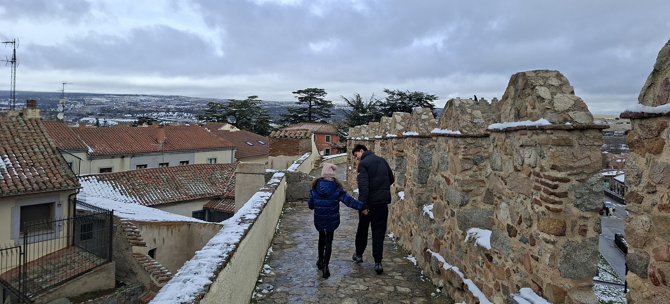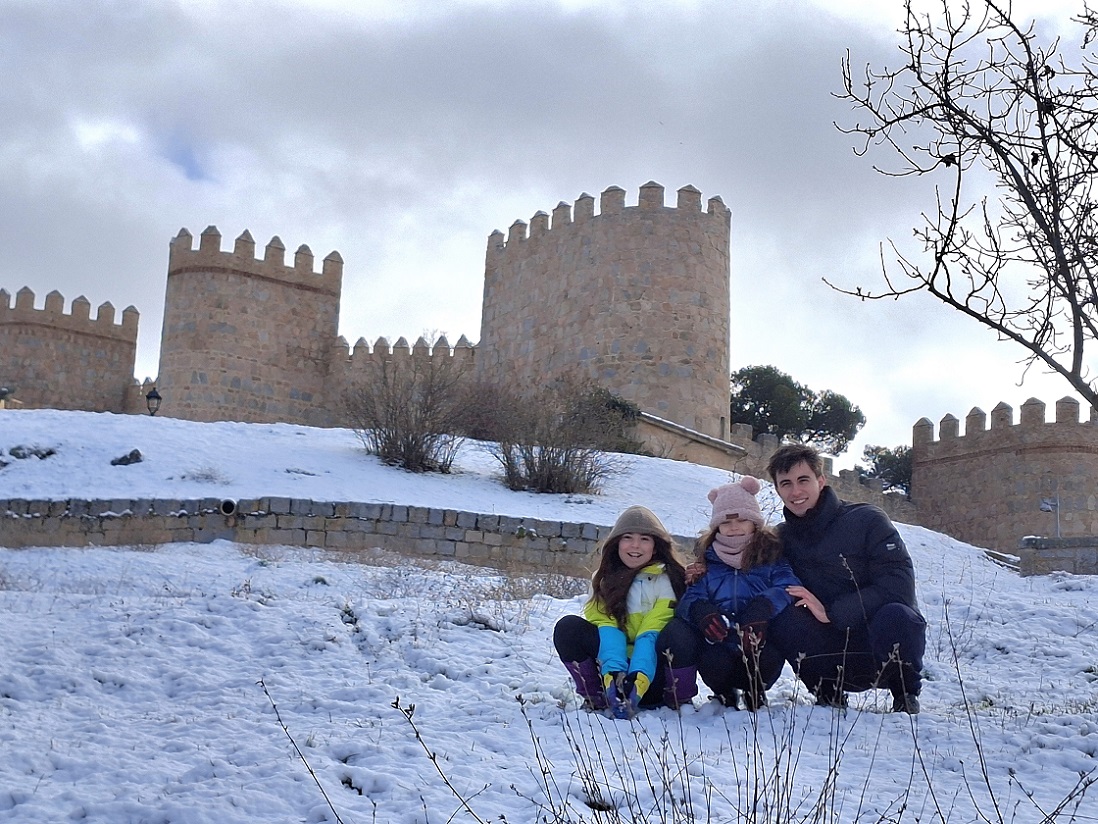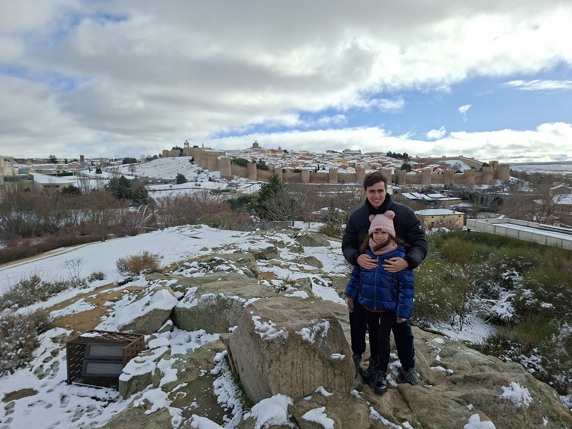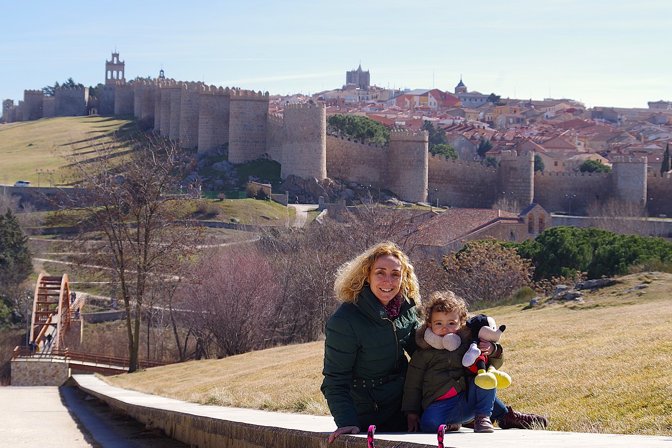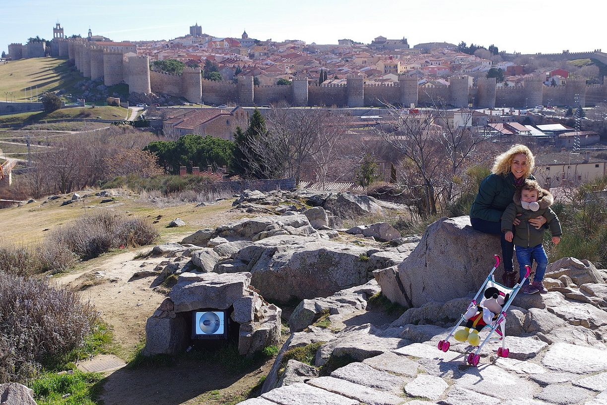 Aquí abajo, un par de fotos de la anterior vez que visitamos Ávila, en febrero de 2019, y sin nieve. La muralla sigue igual, pero es increible lo que ha crecido Inés desde entonces... aunque todavía sigue conservando su muñeco de Mickey.