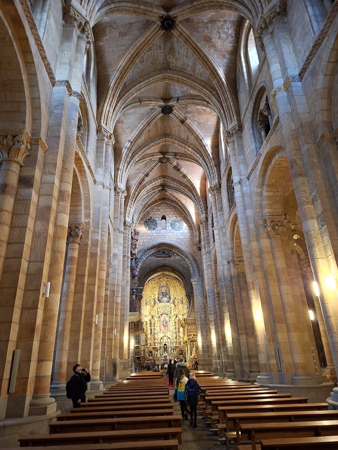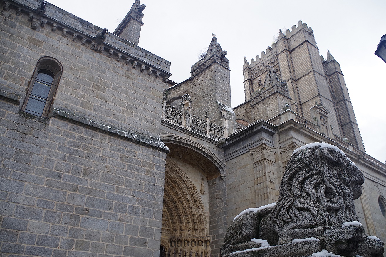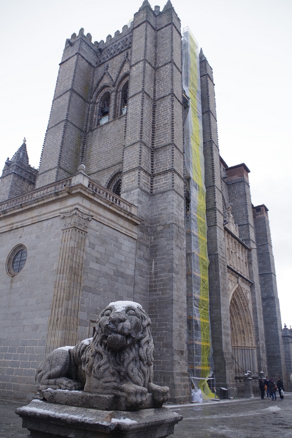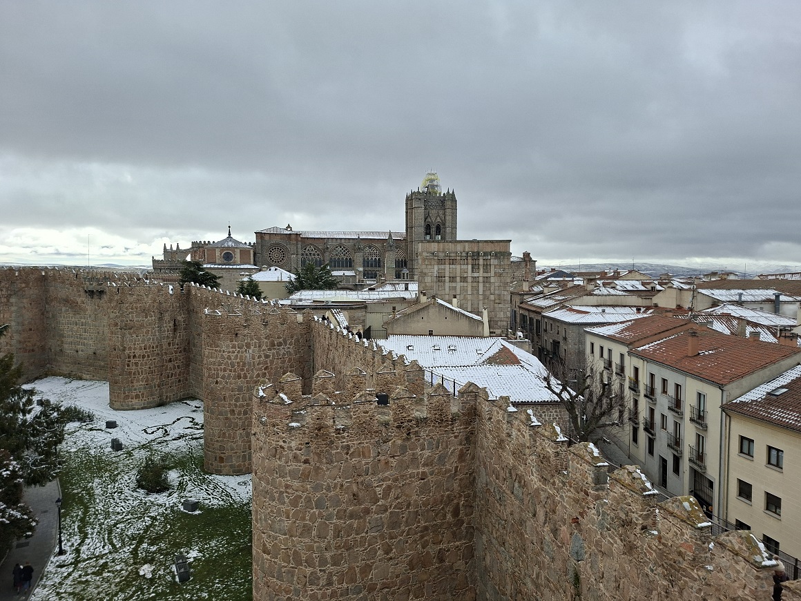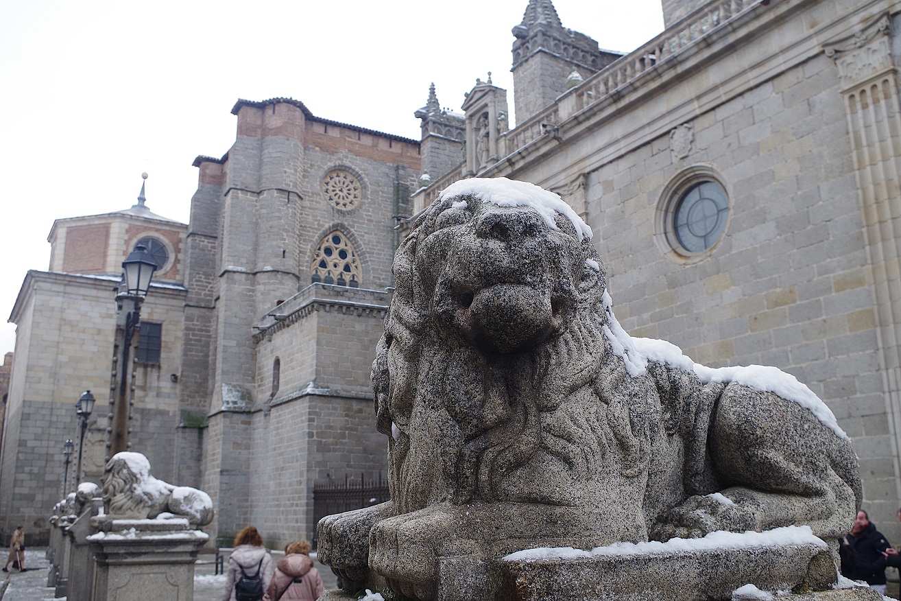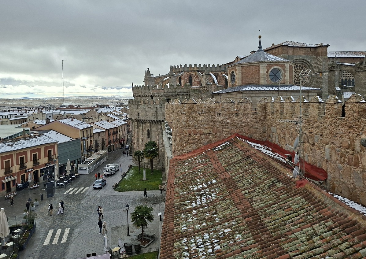 Lo siguiente era ir a ver la catedral, pero justo acababan de cerrar cuando llegamos, a las 18:00, así que pusimos rumbo hacia la iglesia de San Vicente que sabíamos que cerraba a las 19:00. Abajo, foto de la catedral con las últimas luces del día, y en la misma plaza, el palacio de los Velada, convertido en un fantástico hotel como decía antes. A esas horas finales del día, la ciudad luce casi mágica con esa cálida luz justo antes de anochecer. Como podéis ver, la nieve que había por la mañana ya se ha derretido casi toda.
