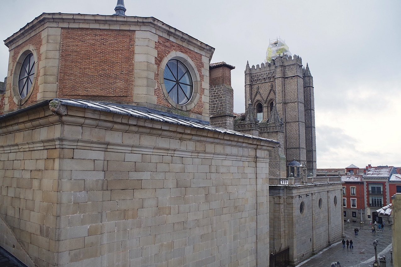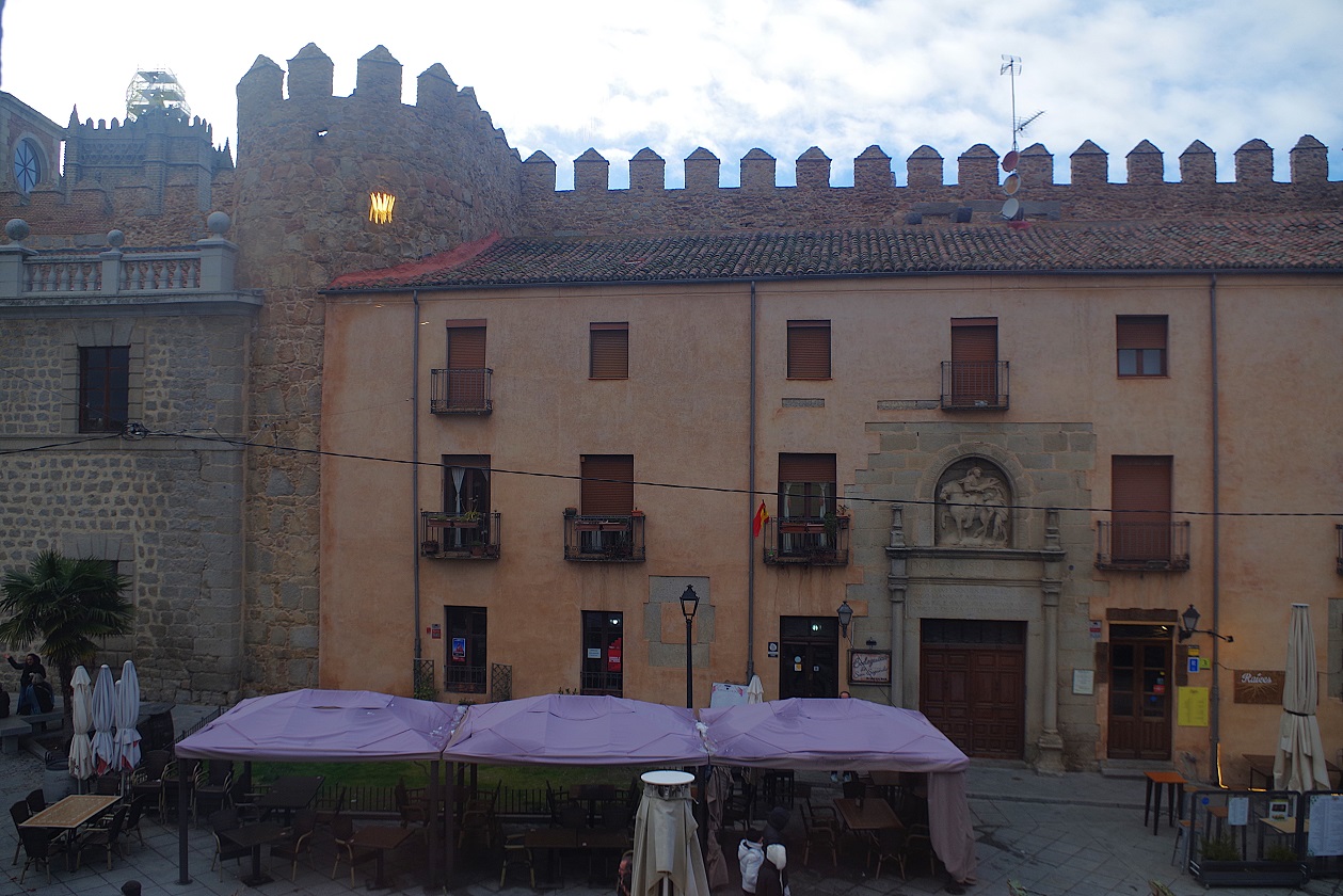 Las fotos de arriba están sacadas desde la puerta del restaurante. A la izquierda, la puerta de la catedral, también llamada de las "carnicerías" porque durante siglos se vendía carne en ese lugar. Al lado de la puerta, la inmensa mole del ábside de la catedral, que se ve espectacular desde allí. En la foto de la derecha, otro edificio adosado a la muralla, del que ya vimos antes su tejado desde arriba. Se trata de la Casa de la Misericordia, del siglo XVI, de la época en que Santa Teresa vivía en Avila. En su día era un establecimiento de uso asistencial y benéfico: Acoger pobres, enfermos, huérfanos y peregrinos. Hoy la planta baja es un restaurante.