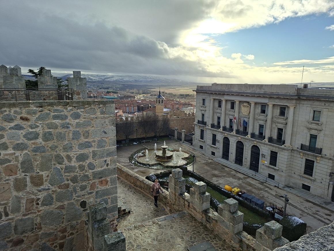 Y también bonitas vistas hacia la plaza de Adolfo Suárez, intramuros, hacia la parte sur de la muralla, por donde va el paseo por este tramo, que es más corto que el anterior, ya que en cuanto llega al edificio del obispado, se corta.