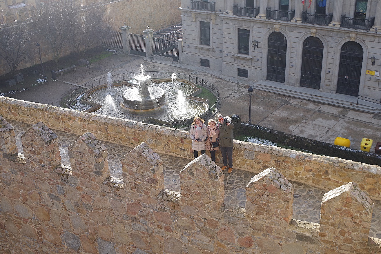 Ahora con la luz del día preferimos entrar por la puerta del Carmen, que está un poco más lejos, pero para llegar a ella tenemos siempre a la vista la parte más espectacular de la muralla, y especialmente un día como hoy, que toda la ladera sobre la que se asienta la muralla está nevada, es un paseo muy bonito. Abajo podéis ver un par de fotos de cuando fuimos en 2019. La puerta del Carmen, que se ve mejor en la foto con zoom de la derecha, es la que está justo bajo la espadaña, en la parte más alta de la muralla. En la foto de la izquierda se ve el puente en la parte baja de la ruta, y el camino en zig-zag que hay después.