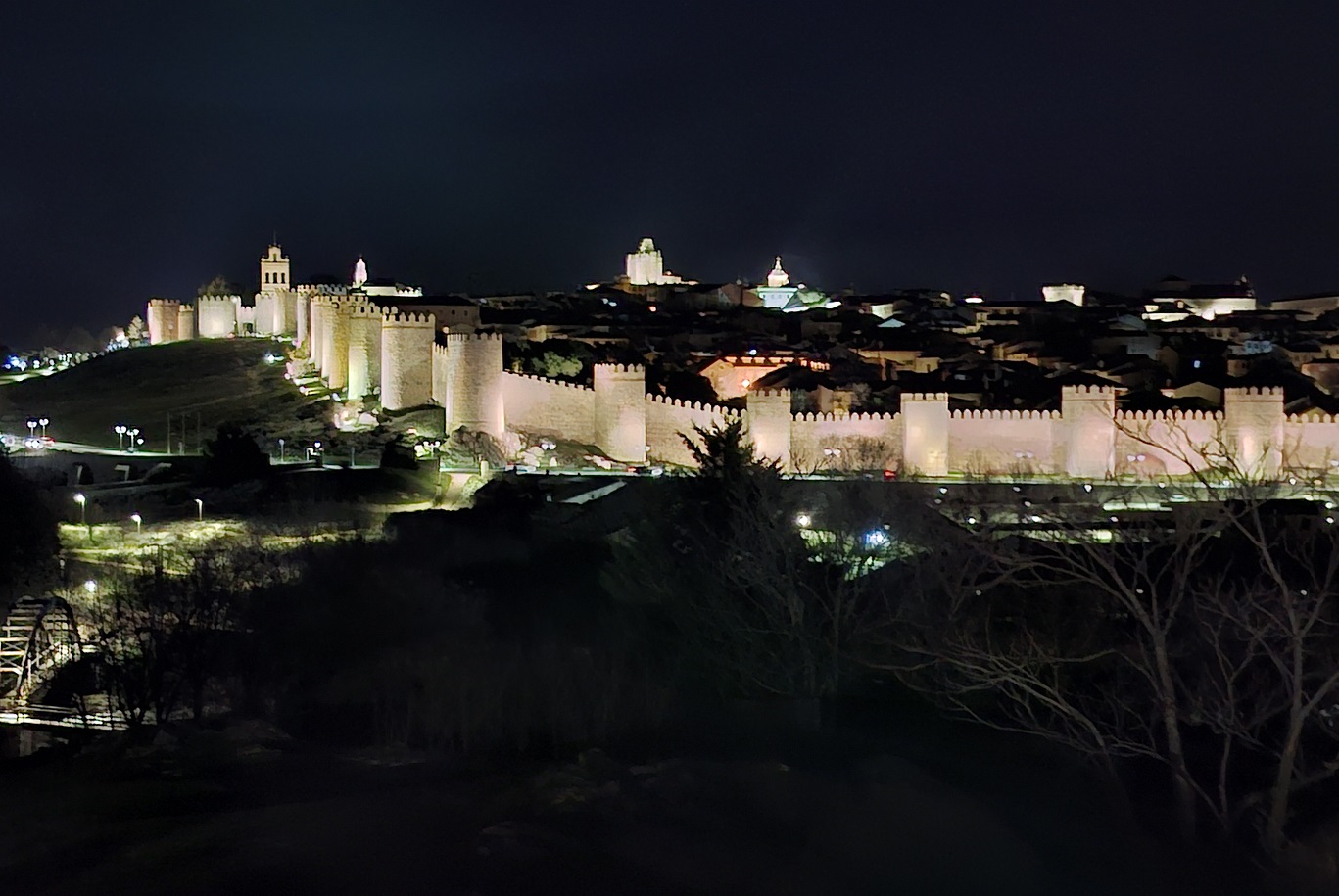 Y desde aquí seguimos caminando hacia la puerta del Adaja, la situada en la zona oeste de la muralla, ya que era el camino más directo para volver hacia los coches. Desde ahí atravesamos el parque y cruzamos el rio por el mismo puente que esa misma mañana, subiendo entonces la cuesta hasta el mirador de los cuatro postes. Hicimos una última foto de la muralla iluminada antes de emprender el camino a casa.