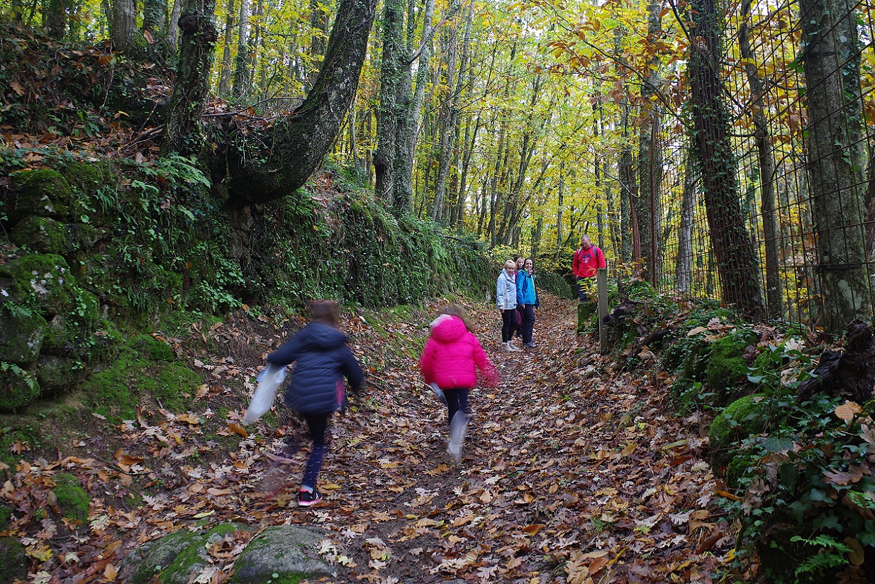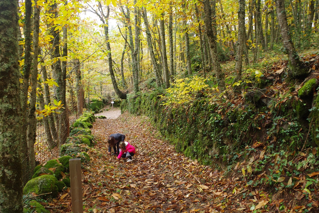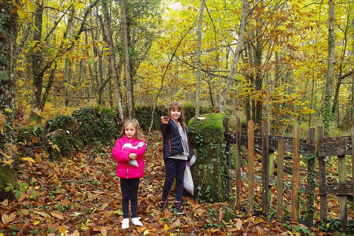 Las niñas estaban encantadas. Cada una llevaba una bolsa, e iban cogiendo cantidad de castañas que estaban en el suelo directamente sobre el camino. El plan era asarlas luego en la chimenea de la casa, por la noche. El bosque estaba magnífico, sin duda Noviembre es la mejor época para recorrer estos bosques de castaños, que se visten de mil colores antes de tirar todas sus hojas para el invierno.