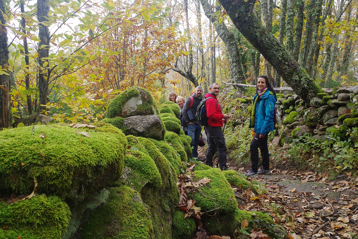 La idea era llegar por el castañar hasta el cercano pueblo de Peñacaballera, pero al llegar a un punto, donde ya abundaban más los prados verdes que los castaños, el sendero era realmente un barrizal con enormes charcos más que un camino (había estado lloviendo los días anteriores), así que decidimos dar la vuelta. Se puede volver a Puerto de Béjar por la carreterilla que une ambos pueblos, pero en cuanto pudimos nos metimos por el camino del castañar, ya que es una carretera sin arcén.
