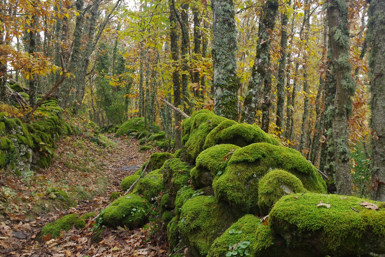 Así que la hicimos caso, y sin necesidad de coger el coche comenzamos nuestro paseo desde la misma casa. Allí mismo, junto a la casa, ya empezaban los castaños, y apenas unos pasos después de que el camino cruce por debajo la autovía A-66, estábamos en un sendero muy chulo que serpenteaba por un espeso bosque de castaños, y no había nadie más, estábamos solos (y eso que es temporada alta para estas cosas, cuando la castaña está en su punto).