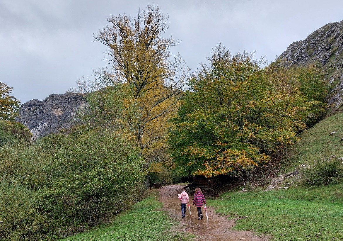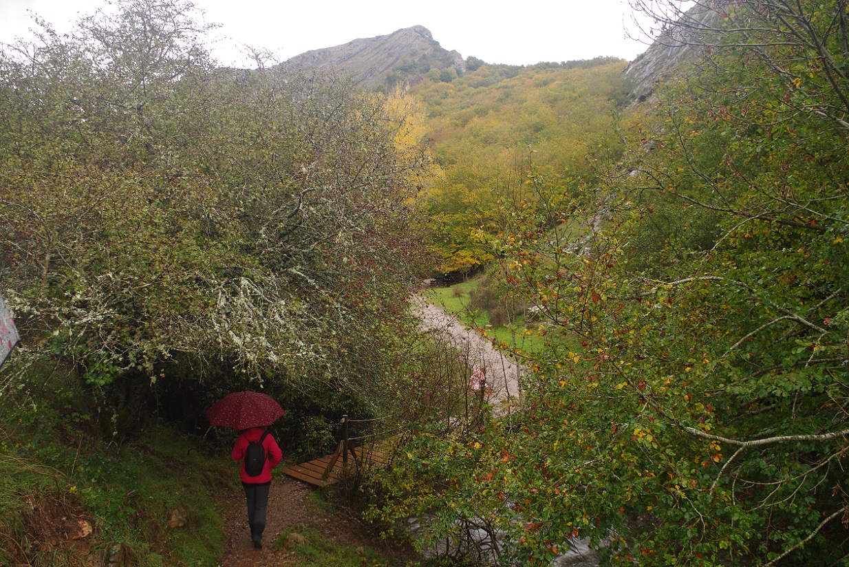 Enseguida sales del pueblo, que es muy pequeño, y vas por un sendero en el que tienes a la derecha el arroyo que seguirás hasta el hayedo. Al poco de dejar las últimas casas atrás, pasarás junto al cementerio. Abajo tenéis una fotos de esta primera parte del paseo. Estaba lloviznando muy ligeramente, es lo que tiene el otoño en el norte.