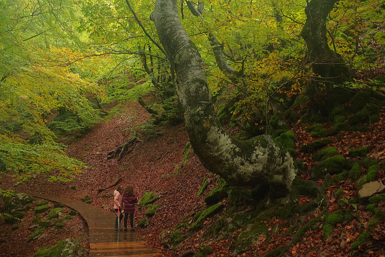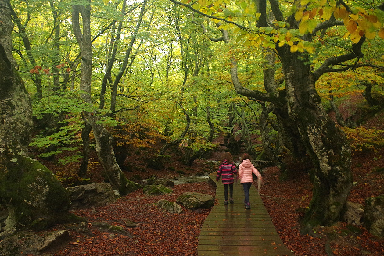 A partir de este puente, el camino ya va siempre por pasarela de madera, zigzageando entre las hayas retorcidas que nos vigilan mientras caminamos entre ellas. Inés y Nora van abriendo el camino sin miedo a los misteriosos seres que habitan este bosque.