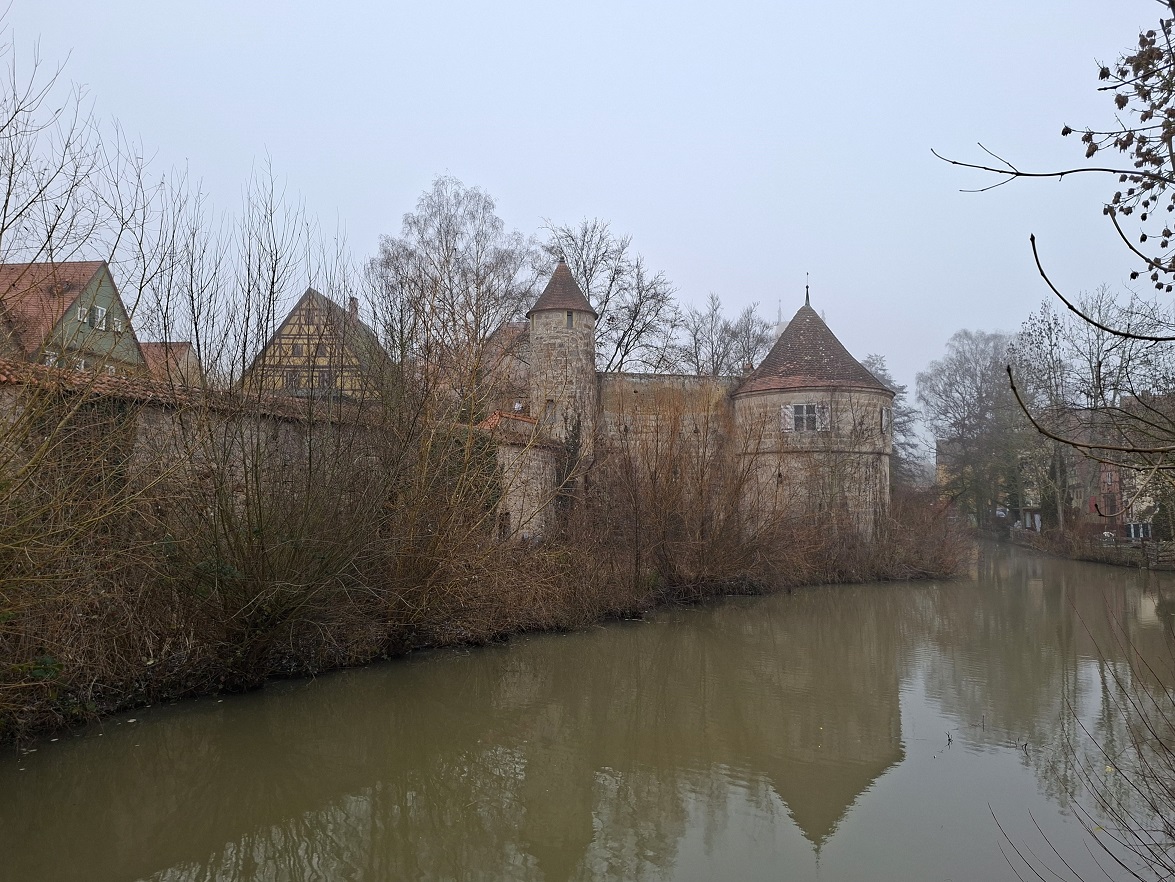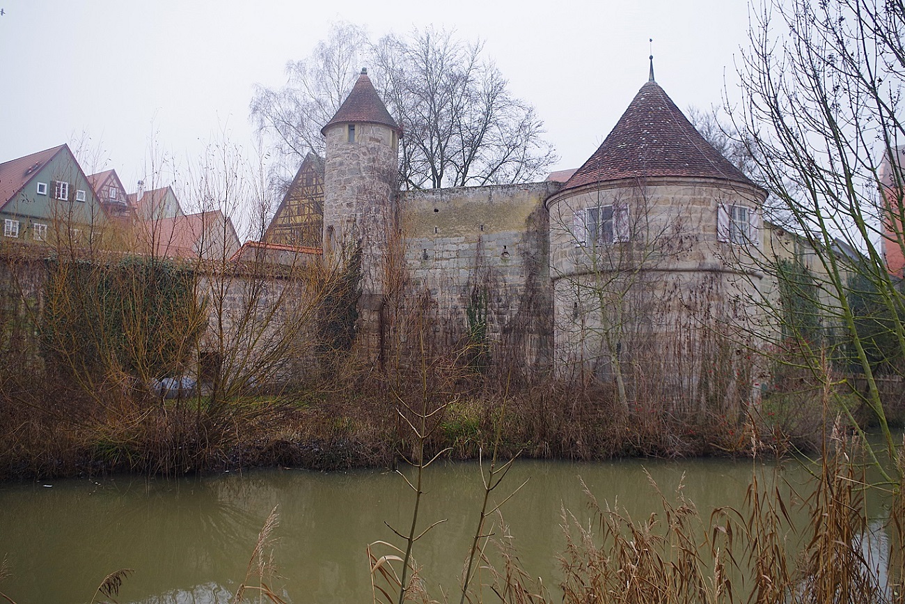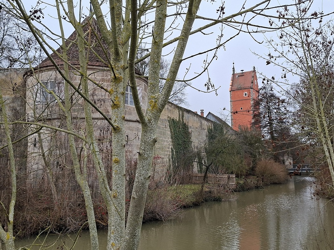 Dinkelsbühl es pequeño, y es uno de los pocos pueblos medievales alemanes que conserva íntegra su muralla (otro es Rothenburg, que lo veríamos después). Llegamos hasta la misma puerta de la muralla, y allí mismo hay un aparcamiento al aire libre, justo al lado de la orilla del rio, y enfrente de la muralla. Es un aparcamiento pequeño, en otras épocas imagino que será difícil encontrar sitio aquí, pero ahora estaba casi vacio, al fin y al cabo, era un Lunes de Diciembre y hacía bastante frio. Abajo podéis ver unas fotos del tramo de muralla que teníamos justo enfrente, separados de ella por el rio.