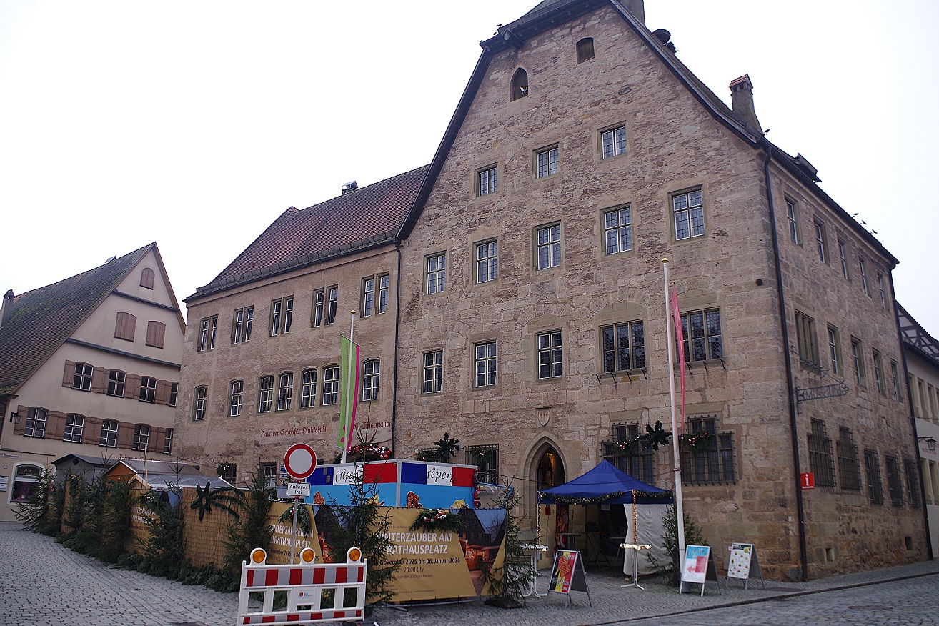 Como no nos sobraba mucho tiempo, no fuimos hasta allí. Nos dirigimos hacia la Altrathausplatz, una de las plazas más fotogénicas de Dinkelsbühl, que está junto a otra de las puertas de la muralla, muy característica por estar pintada de naranja. Esa puerta nos pillaba de camino para ir acercándonos ya a donde teníamos el coche. Allí, junto al enorme edificio del que fue ayuntamiento de la ciudad hasta 1855, y donde está hoy día la oficina de turismo y un museo sobre la historia de la ciudad (que no vimos) se instala otra parte del mercado navideño, que también estaba cerrada a esas horas, como podéis ver en las fotos de abajo.