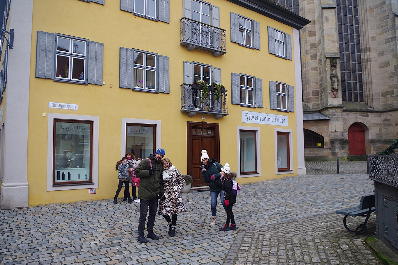 Ya dentro de la ciudad, caminamos hacia la Marktplatz, donde está la catedral de San Jorge, que sería el centro de la ciudad. En la foto de abajo a la izquierda podéis ver al fondo de la calle, entre la niebla, la torre de la catedral. La primera prioridad era encontrar un sitio para desayunar, así que íbamos con el radar puesto para encontrar cafeterías. Pasamos por una junto a la catedral, que podéis ver en la foto de abajo a la derecha, pero estaba muy llena, así que seguimos buscando.
