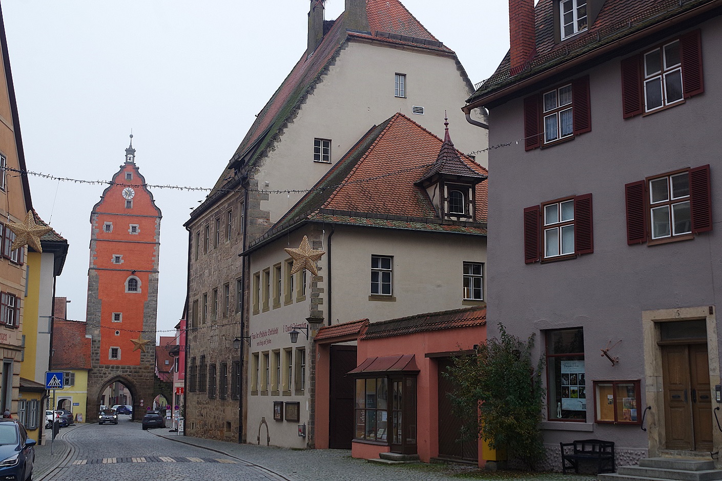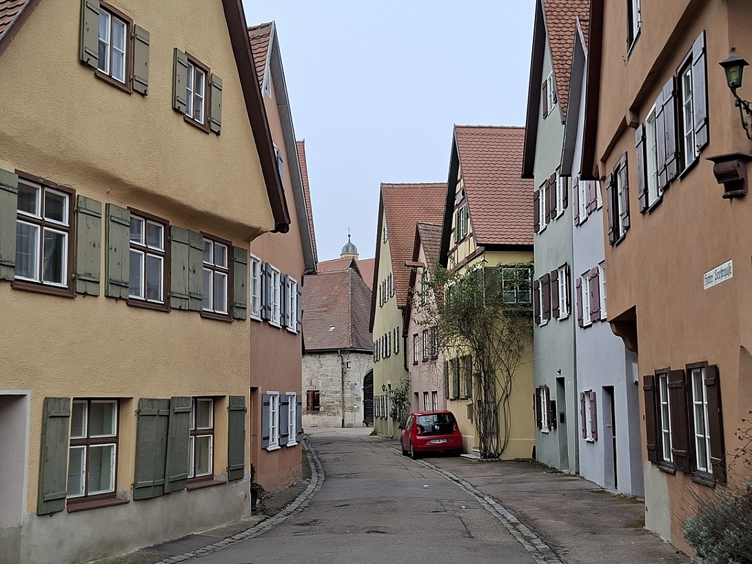 La foto de arriba a la derecha está sacada ya desde el aparcamiento, y se ve claramente la puerta Wörnitzor por donde habíamos salido. Como conclusión final, Dinkelsbühl es una ciudad con un tejido urbano medieval muy bien conservado, y unas casas históricas muy coloridas que forman un conjunto muy armonioso y bello. Hay una cosa que lo desluce un poco, y es que no hay un nucleo central que sea peatonal, los coches pueden pasar (y lo peor de todo, aparcar) en casi cualquier sitio, lo cual hace que sea muy difícil sacar buenas fotos sin que salgan coches, solo esas espectaculares casonas. Creo que deberían buscar algún tipo de solución para que no se pudiese aparcar en las calles del recinto interior a la muralla. Otra cosa que nos gustó mucho de esta ciudad es que no es demasiado turística, y no sufre de las multitudes de turistas que sí tiene por ejemplo nuestro próximo destino, Rothenburg. Estuvimos como un par de horas, y la verdad es que nos supo a poco, esta ciudad merece dedicarle medio día.