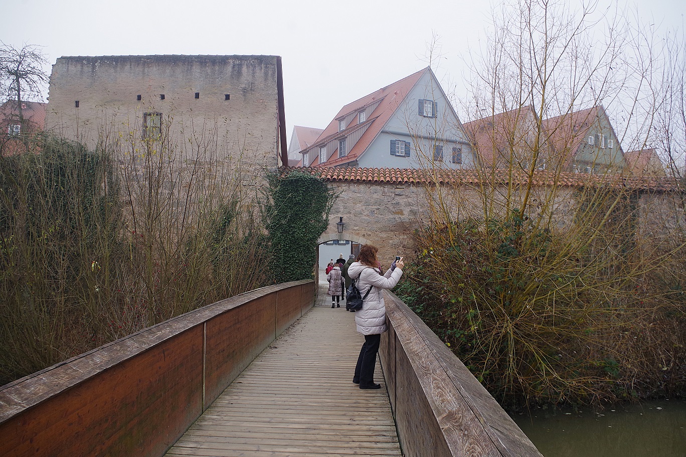 Justo donde ese espectacular edificio medieval, se puede ver la puerta que mencionaba antes, la puerta Wörnitzor, la más antigua de la ciudad ya que fue construída en el siglo XIV. En esa misma plaza, está también la fuente del león, que en invierno se cubre para evitar que las heladas la puedan estropear. Un detalle que podéis ver en las fotos, es la poca gente que hay en esta ciudad. Pasa algo parecido a lo que nos encontramos el día anterior en Schwabisch Hall, al no ser turístico, aunque sea un lugar espectacular, no es muy visitado. La gente va en masa a los sitios que aparecen en las guias y están en los circuitos clásicos, como podríamos comprobar poco después en Rothenburg.