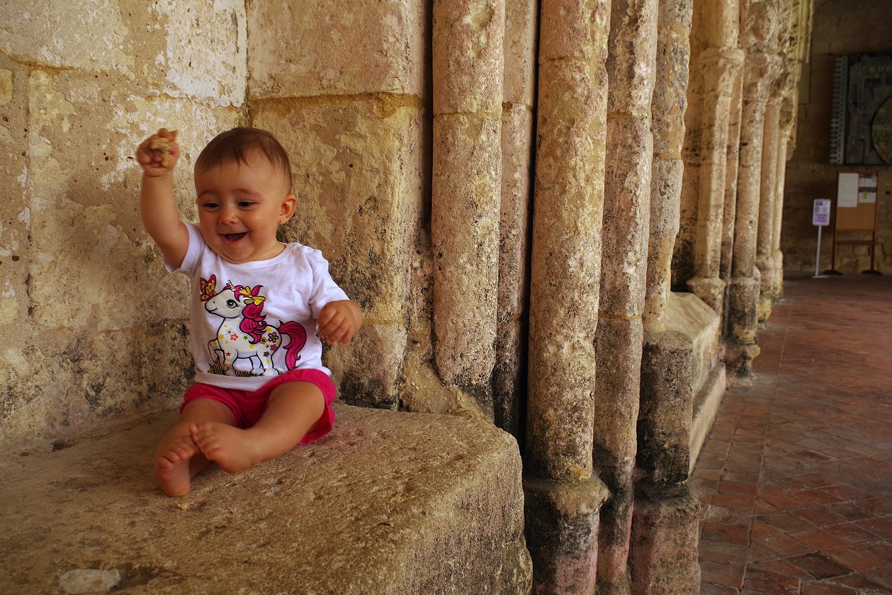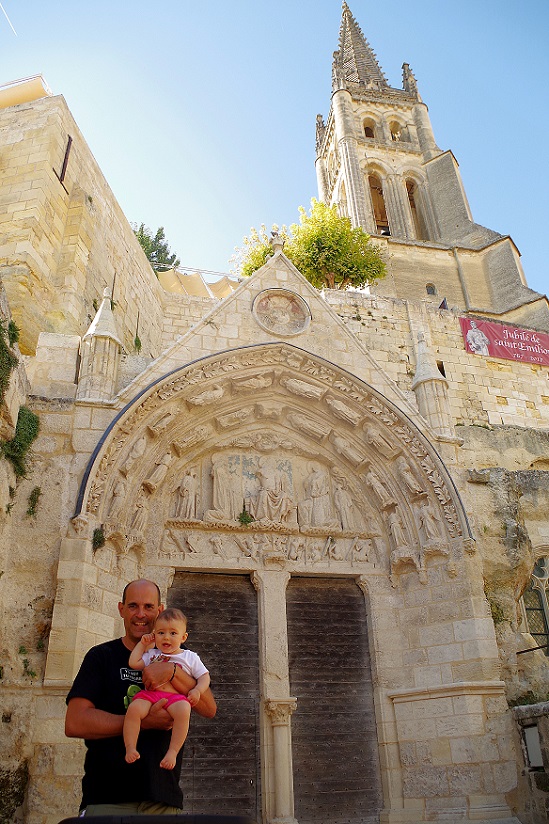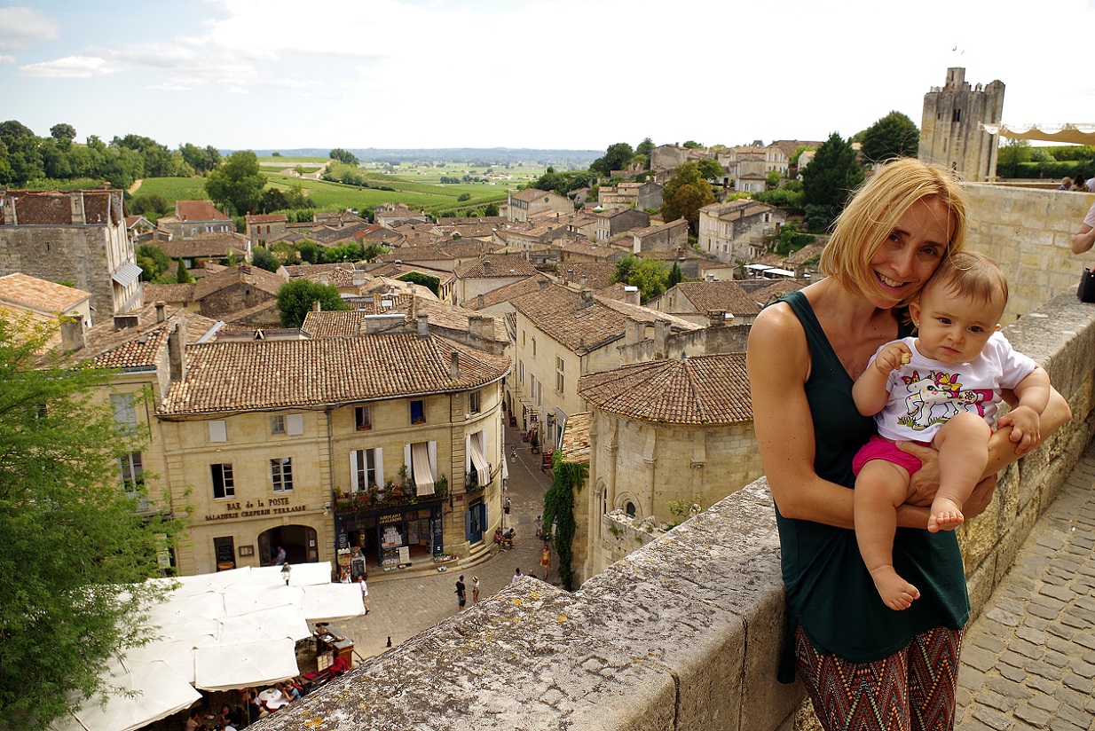 Inés estaba muy despierta, y solo quería que la bajásemos del carro y la tuviésemos en brazos o la dejásemos en el suelo. Después de la colegiata, subimos a un mirador desde donde hay una bonita vista del casco histórico de Saint Emilión. Este mirador es sin duda el lugar más espectacular y fotogénico del pueblo. Está situado justo encima de la iglesia monolítica, junto al campanario de dicha iglesia.