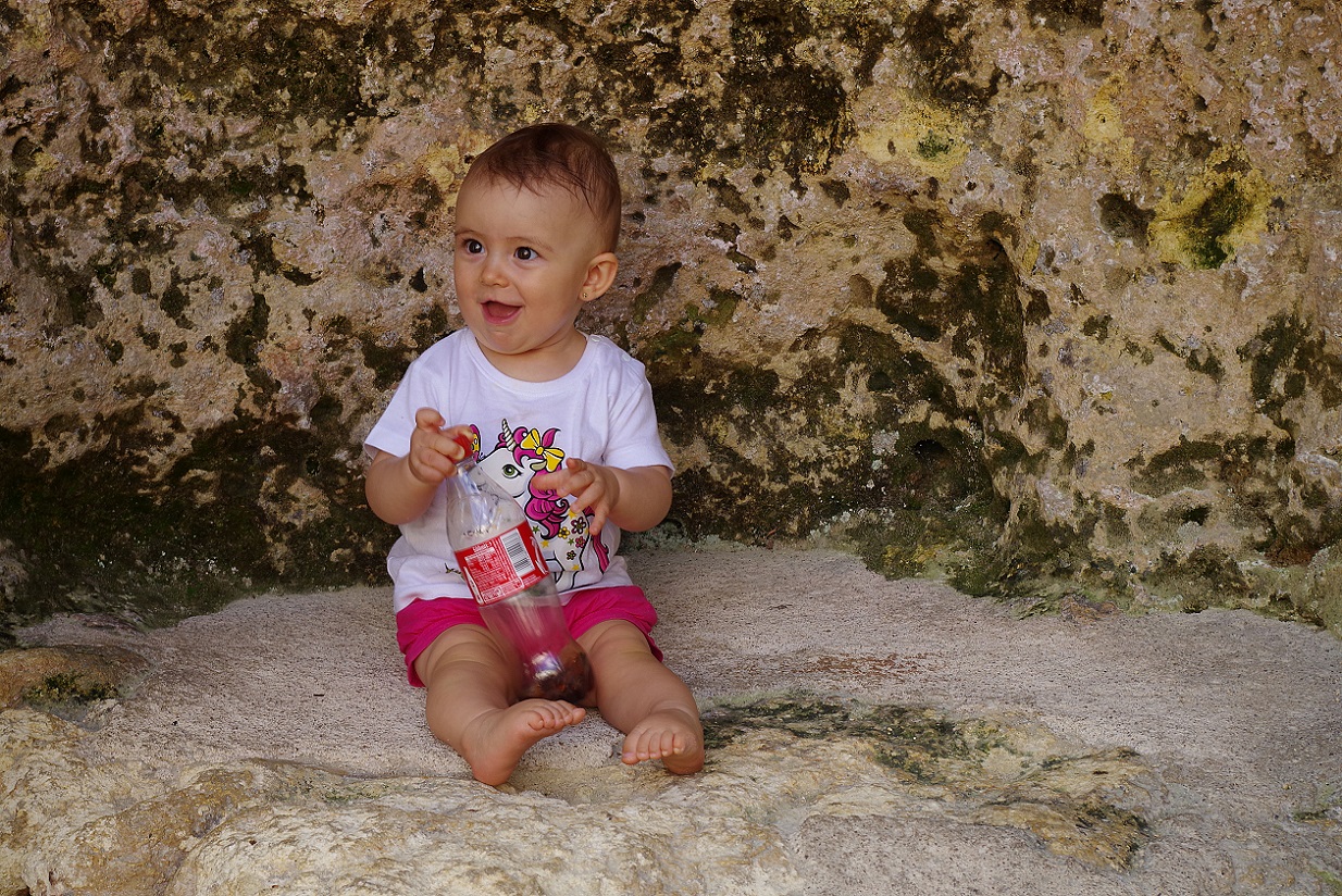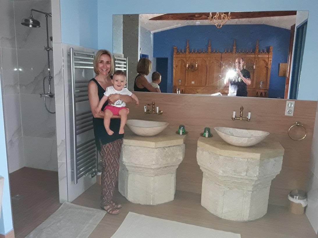 Una vez acabada la visita, seguimos paseando un rato por Saint Emilion. Inés acabó durmiéndose en el carro durante el paseo. Después, volvimos al coche para ir ya hacia nuestro alojamiento, una mansión muy bonita situada en un pequeño pueblo llamado Rauzan, a 20 km de distancia. Hacía bastante calor, y nos apetecía descansar el resto de la tarde en la piscina de la mansión. Abajo, una foto de Inés en las calles de Saint Emilión, y a la derecha el baño de nuestra habitación, que era enorme y muy bonito, con dos capiteles de piedra sosteniendo los dos lavabos.