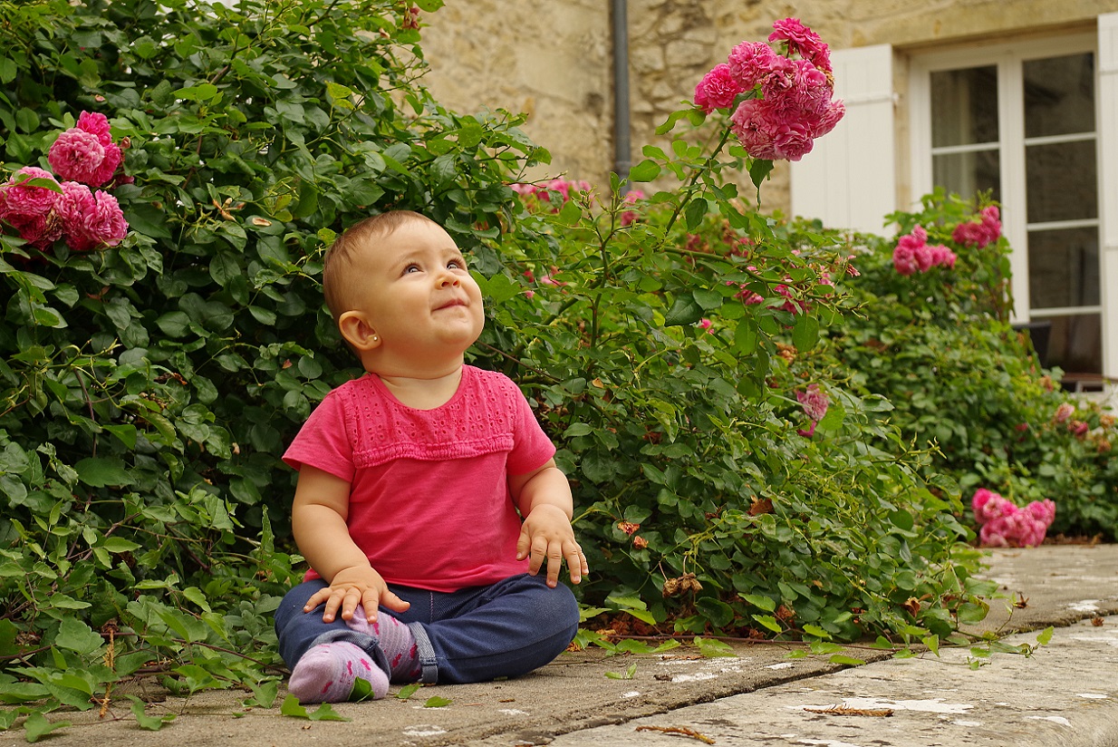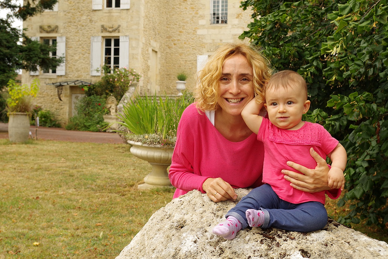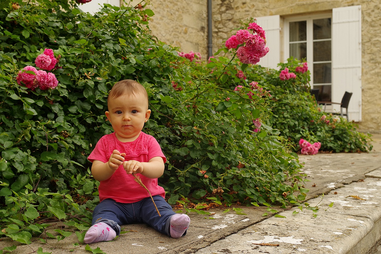 Para volver, una vez llegamos al viñedo tuvimos que iluminarnos con las linternas de los móviles. Fue una pequeña aventura muy emocionante. Inés iba encantada, ya daba muestras de que iba a ser toda una viajera. Al día siguiente desayunamos en el salón de la casa, un lugar grande y distinguido. Antes de irnos y emprender viaje hacia el valle del Loira, dedicamos un rato a hacer algunas fotos en la mansión, que resultaba muy fotogénica, como podéis ver abajo.