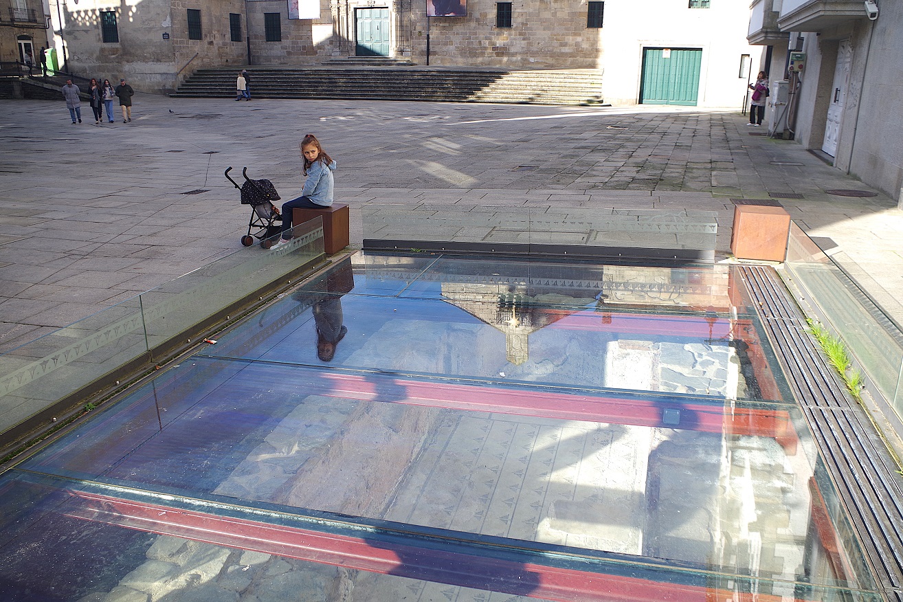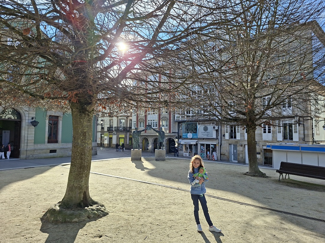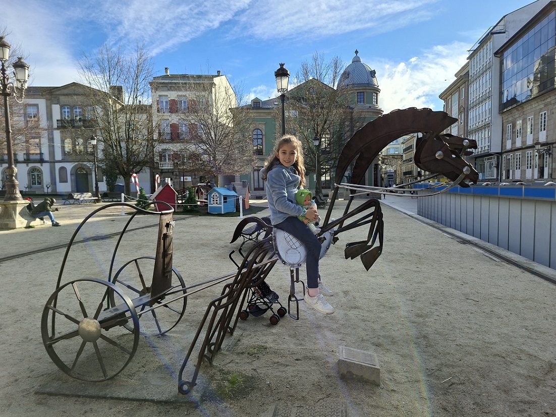 Volvimos a entrar en la ciudad por la puerta anterior a la del obispo Aguirre, la de Campo Castelo, que da acceso a la zona infantil que está junto a uno de los extremos de la plaza mayor. De nuevo, dejamos a Inés jugar un rato en los columpios, y luego atravesamos la plaza mayor para ir de nuevo hacia la catedral, ya que ahí está nuestra siguiente y ya última visita de la ciudad, la casa del Mitreo. Abajo a la derecha, el edificio barroco del ayuntamiento, de 1738.