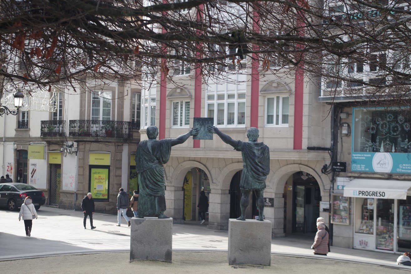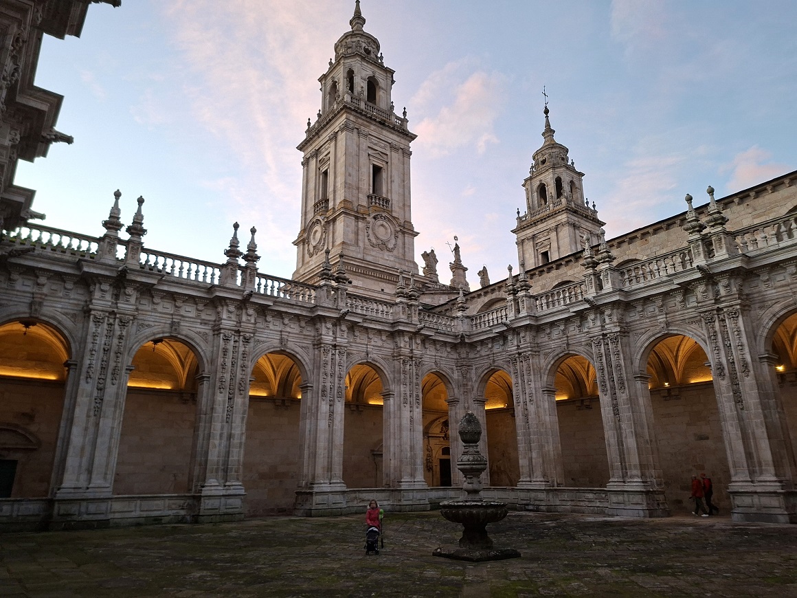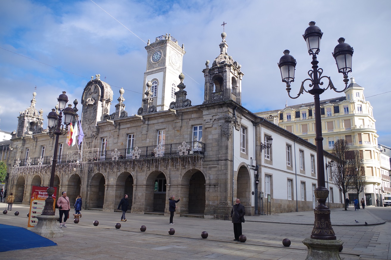 Volvimos a entrar en la ciudad por la puerta anterior a la del obispo Aguirre, la de Campo Castelo, que da acceso a la zona infantil que está junto a uno de los extremos de la plaza mayor. De nuevo, dejamos a Inés jugar un rato en los columpios, y luego atravesamos la plaza mayor para ir de nuevo hacia la catedral, ya que ahí está nuestra siguiente y ya última visita de la ciudad, la casa del Mitreo. Abajo a la derecha, el edificio barroco del ayuntamiento, de 1738.
