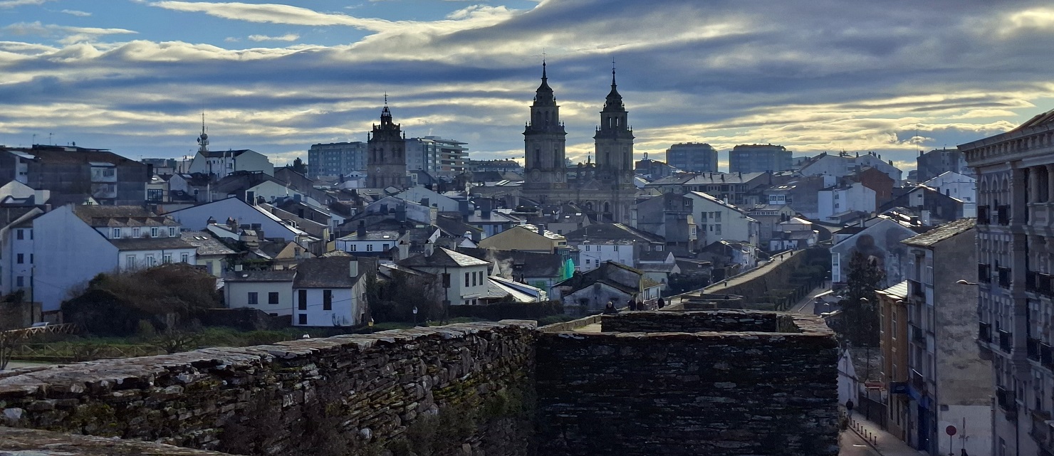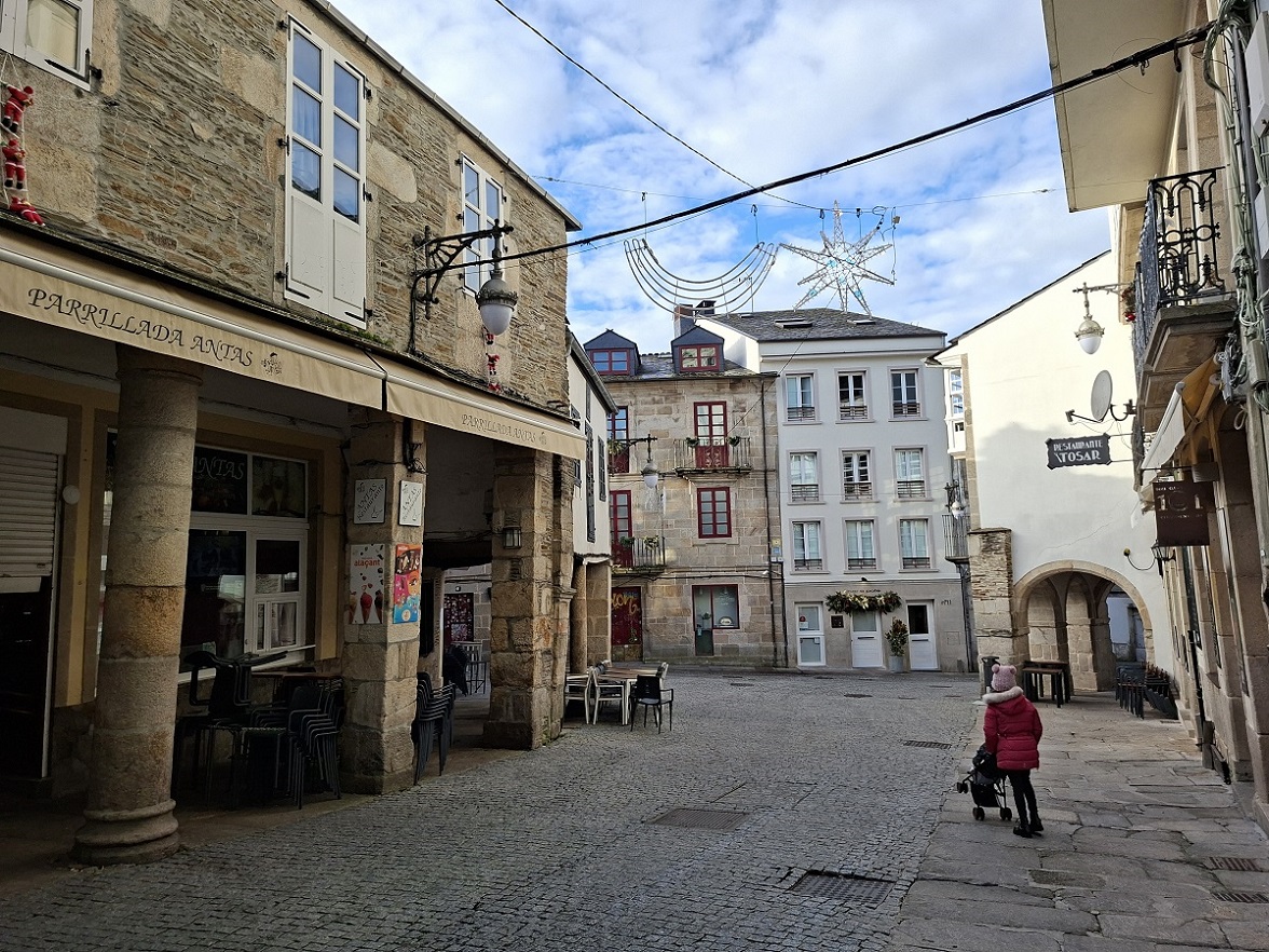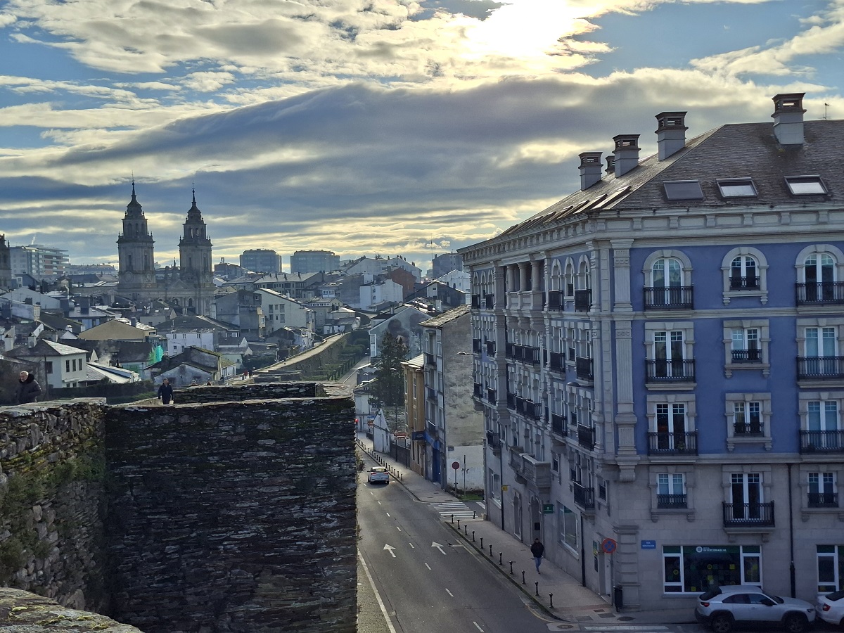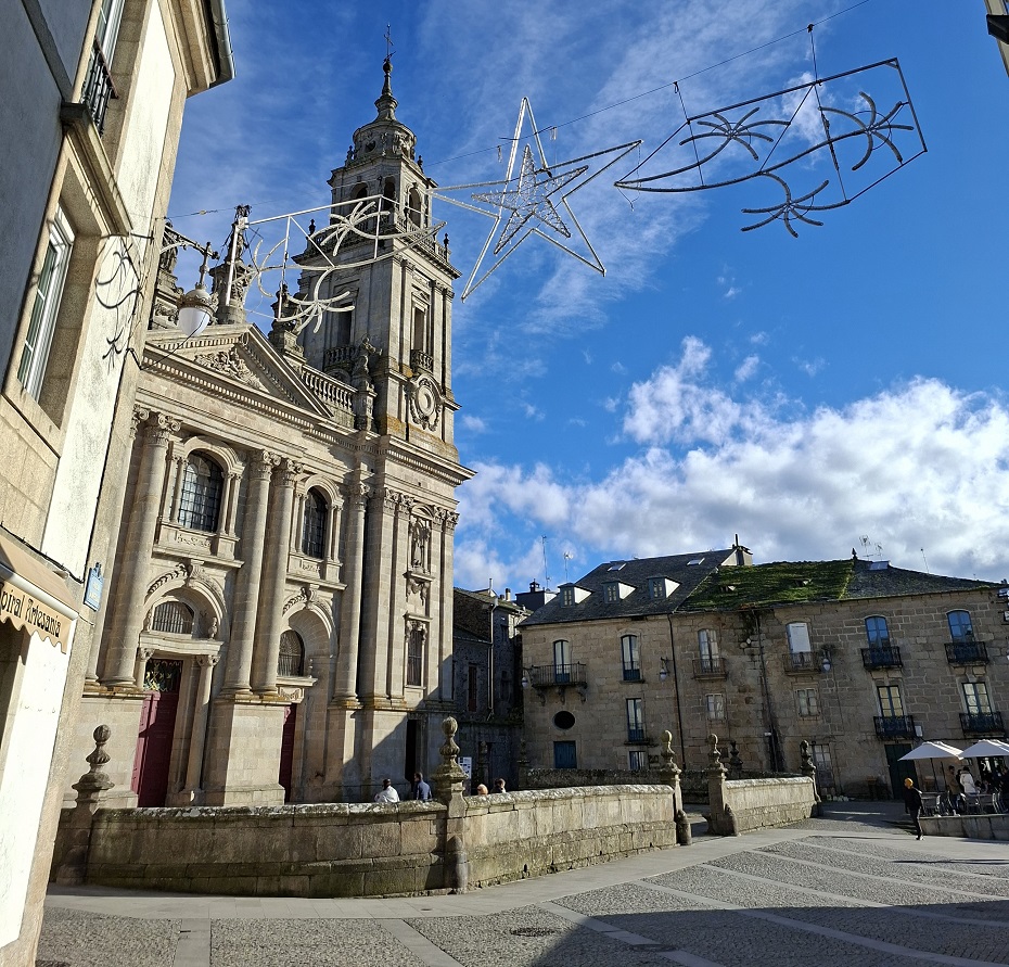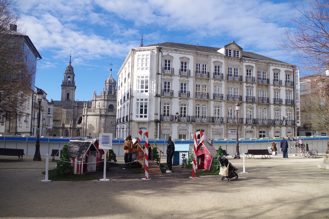 Enseguida llegamos a la puerta monumental de la muralla más cercana al hotel (la del obispo Aguirre), y una vez atravesada, justo al lado está la enorme plaza del ayuntamiento, también llamada plaza de España, donde en esas fechas han puesto un mercado navideño muy bonito. Ahora los puestos están cerrados, pero cuando caiga el sol volveremos para verlo en todo su esplendor. Desde la parte inferior de esta plaza, una ancha calle nos deja ver la parte trasera de la catedral, y hacia allí nos dirigimos. Es una bonita ciudad, fundada por los romanos con el nombre de Lucus Augusti en el año 13 a.C., y que fue declarada Patrimonio de la Humanidad por la UNESCO en el año 2000, especialmente por su bien conservada muralla romana, que se conserva íntegra.
