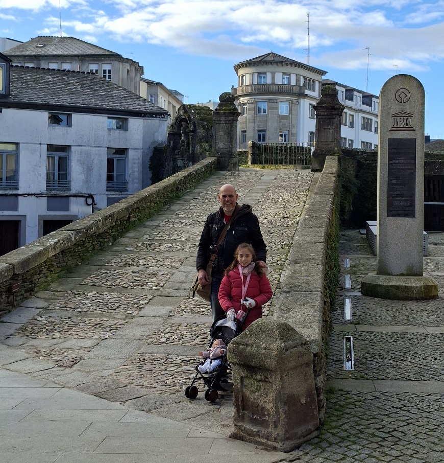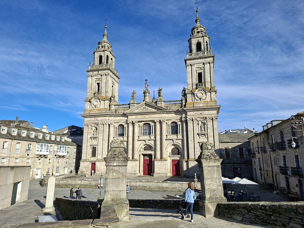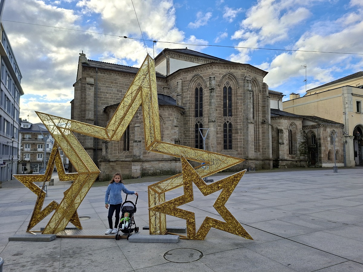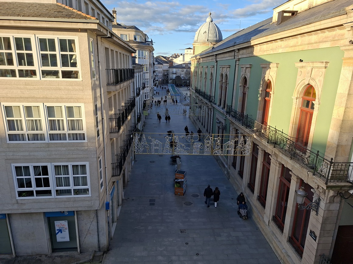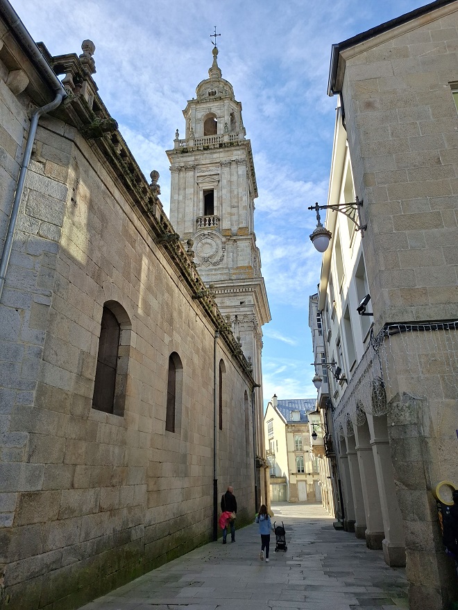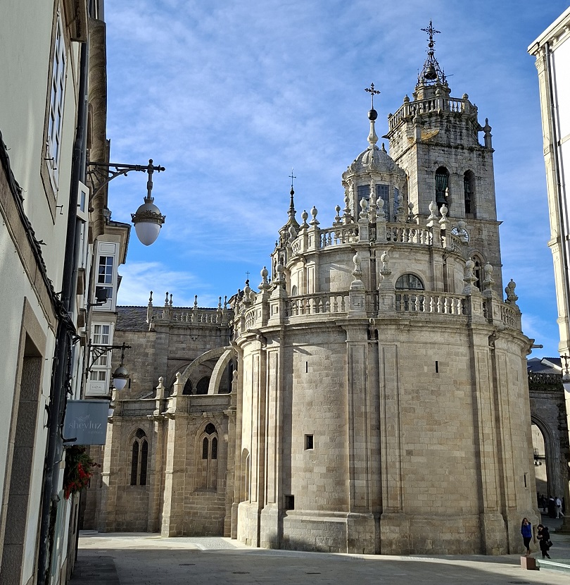 Enseguida llegamos a la puerta monumental de la muralla más cercana al hotel (la del obispo Aguirre), y una vez atravesada, justo al lado está la enorme plaza del ayuntamiento, también llamada plaza de España, donde en esas fechas han puesto un mercado navideño muy bonito. Ahora los puestos están cerrados, pero cuando caiga el sol volveremos para verlo en todo su esplendor. Desde la parte inferior de esta plaza, una ancha calle nos deja ver la parte trasera de la catedral, y hacia allí nos dirigimos. Es una bonita ciudad, fundada por los romanos con el nombre de Lucus Augusti en el año 13 a.C., y que fue declarada Patrimonio de la Humanidad por la UNESCO en el año 2000, especialmente por su bien conservada muralla romana, que se conserva íntegra.
