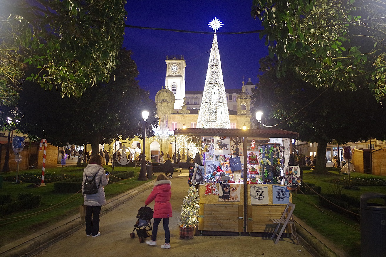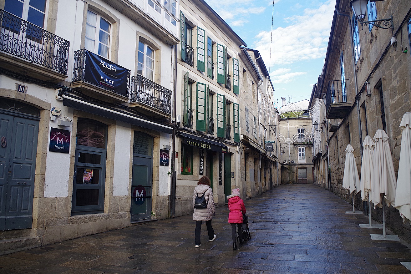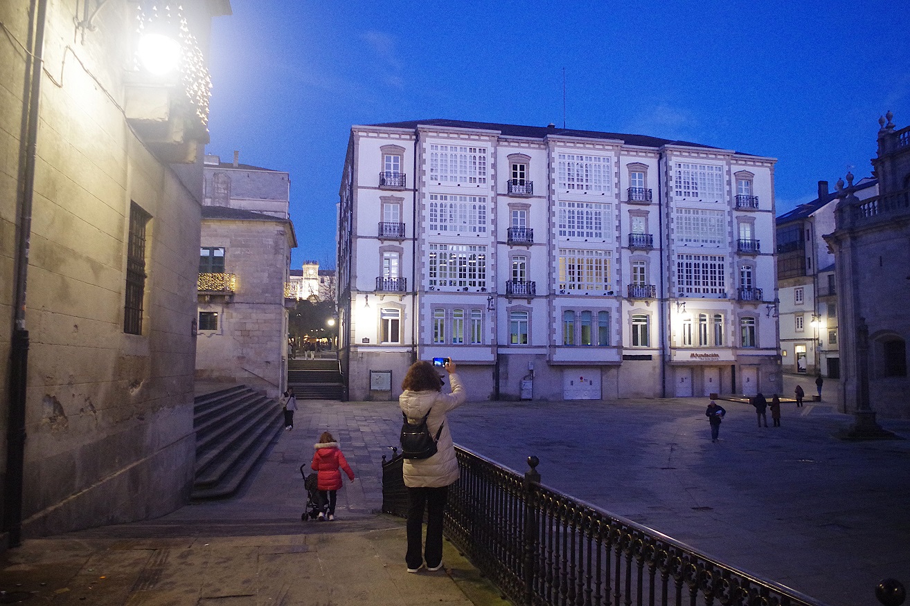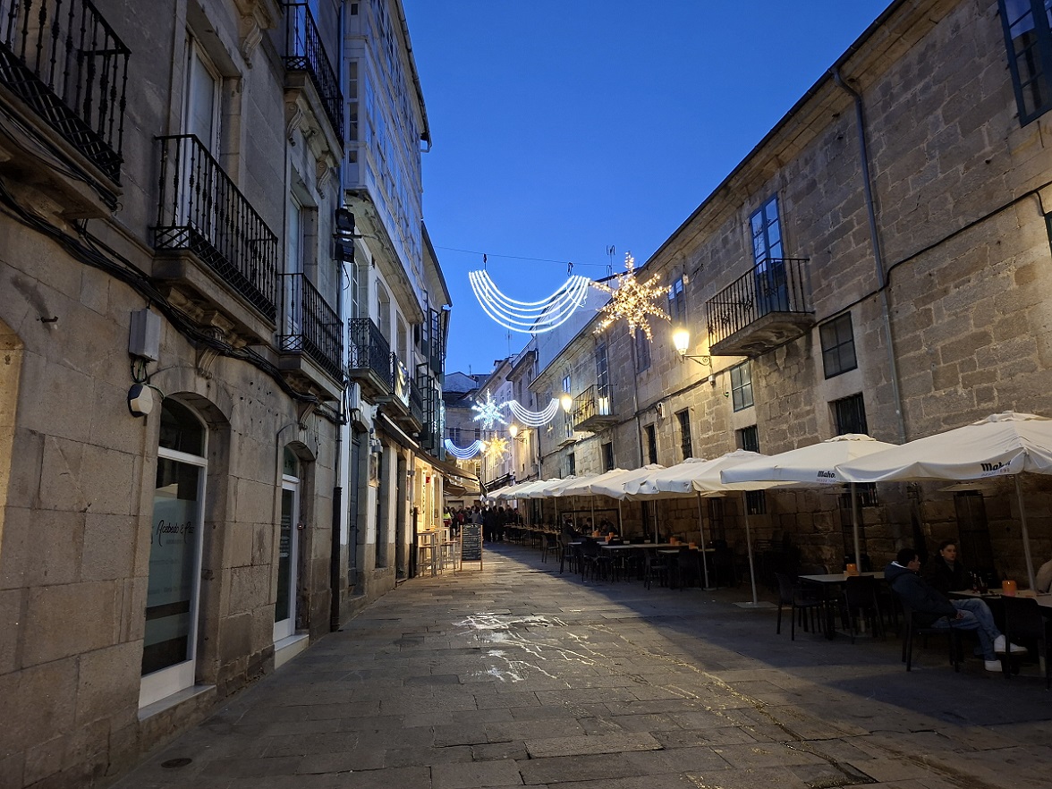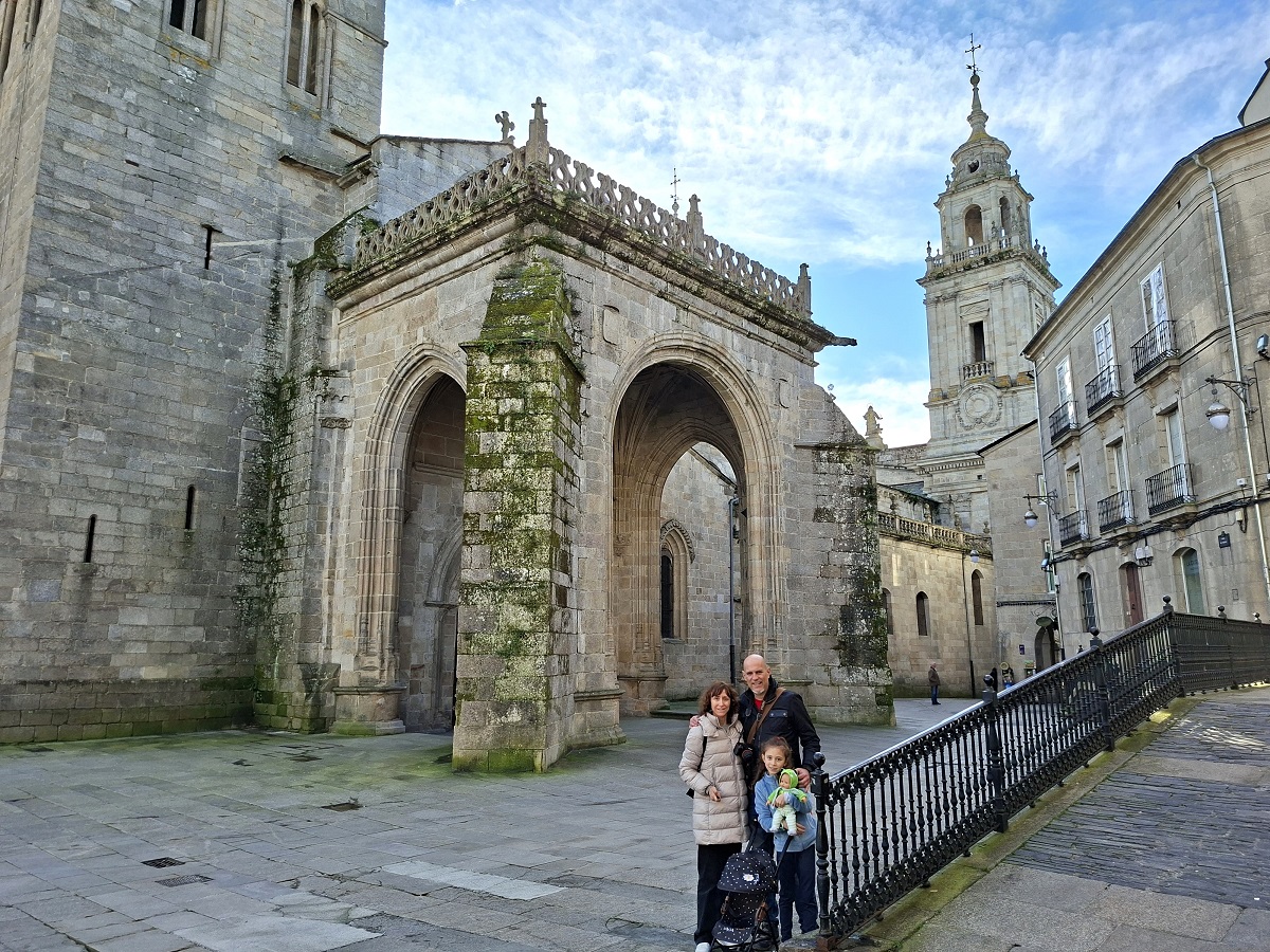 Enseguida llegamos a la puerta monumental de la muralla más cercana al hotel (la del obispo Aguirre), y una vez atravesada, justo al lado está la enorme plaza del ayuntamiento, también llamada plaza de España, donde en esas fechas han puesto un mercado navideño muy bonito. Ahora los puestos están cerrados, pero cuando caiga el sol volveremos para verlo en todo su esplendor. Desde la parte inferior de esta plaza, una ancha calle nos deja ver la parte trasera de la catedral, y hacia allí nos dirigimos. Es una bonita ciudad, fundada por los romanos con el nombre de Lucus Augusti en el año 13 a.C., y que fue declarada Patrimonio de la Humanidad por la UNESCO en el año 2000, especialmente por su bien conservada muralla romana, que se conserva íntegra.
