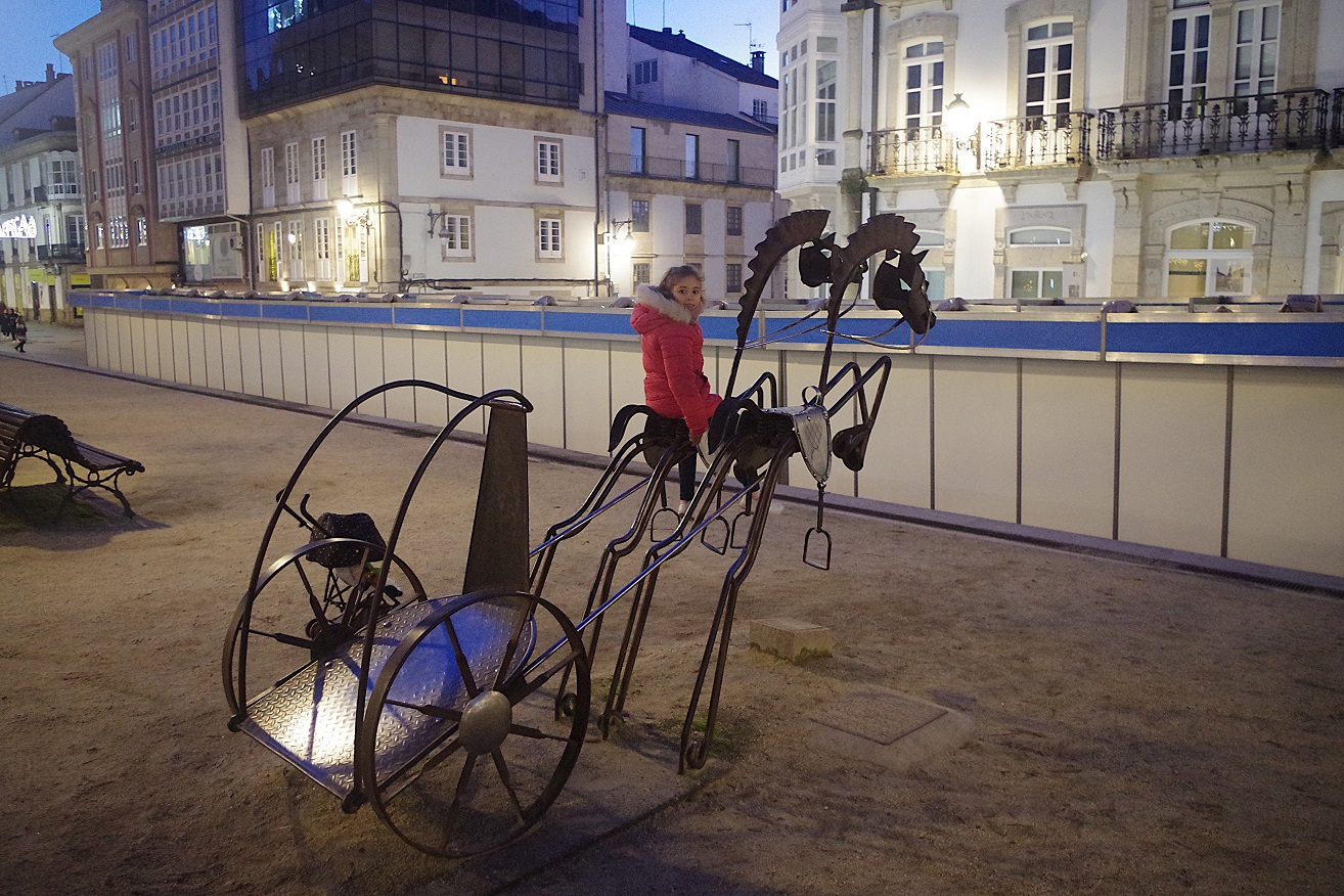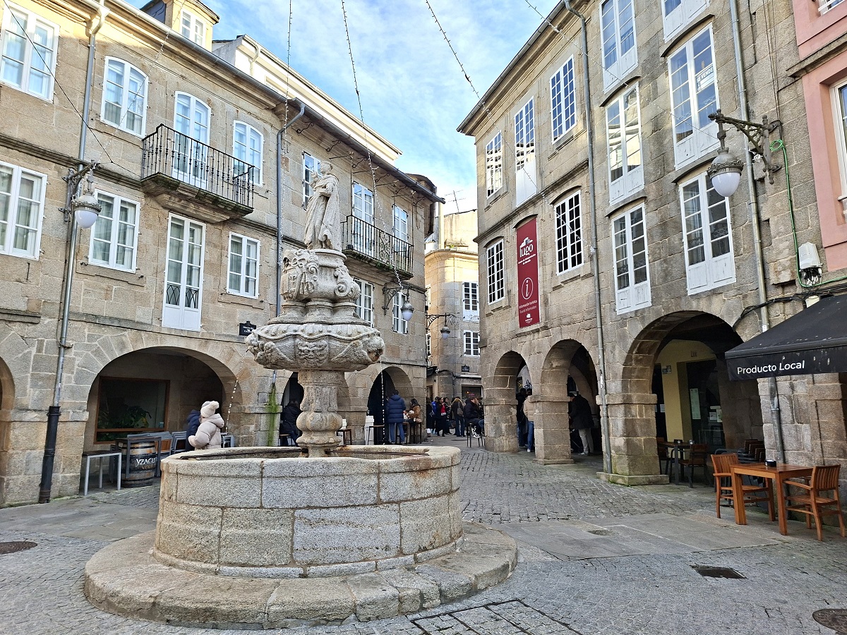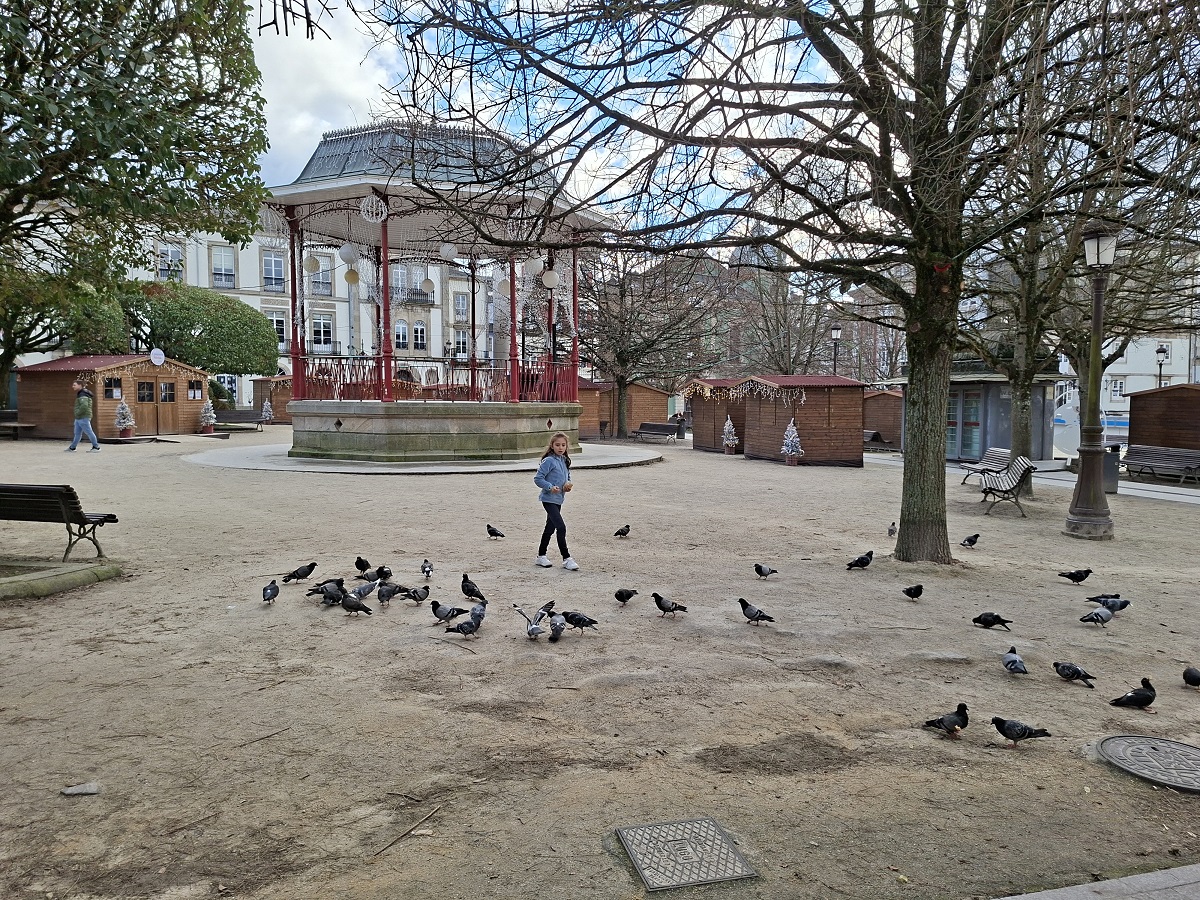 En ese momento eran las 3 de la tarde, hora de ir pensando en comer. Volvimos a la plaza mayor callejeando un poco, y pasamos por la bonita plaza del Campo, que tiene una hermosa fuente en su centro (foto de abajo a la izquierda) y es la zona más típica de tapeo de Lugo. Al parecer, en las fiestas de San Froilán, en Octubre, se hace salir vino tinto por los caños de la fuente. En la plaza, comimos en uno de los restaurantes que hay en su parte izquierda, en terraza, ya que tenían las estufas de gas en forma de seta. De esta manera, Inés podía jugar a dar de comer a las palomas mientras nosotros acabábamos tranquilamente de comer sin perderla de vista. Se pueden ver los puestos del mercadillo navideño, cerrados, junto al kiosko de música.