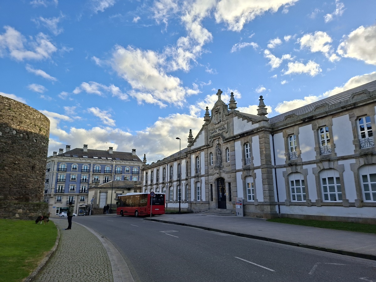 En las fotos de abajo, a la derecha se puede ver la puerta de la muralla llamada del obispo Odoario (la siguiente que te encuentras después de salir por la porta Nova, como habíamos hecho). Es la puerta más moderna de la muralla, ya que el hueco se abrió en el año 1921 para dar servicio al recién inaugurado Hogar de Santa María (foto de la derecha), un edificio del obispado que tenía una función social para acoger a jóvenes sin hogar, donde podían vivir y se les daba una educación. Hoy alberga oficinas de la diputación provincial de Lugo.