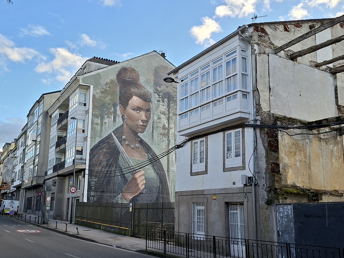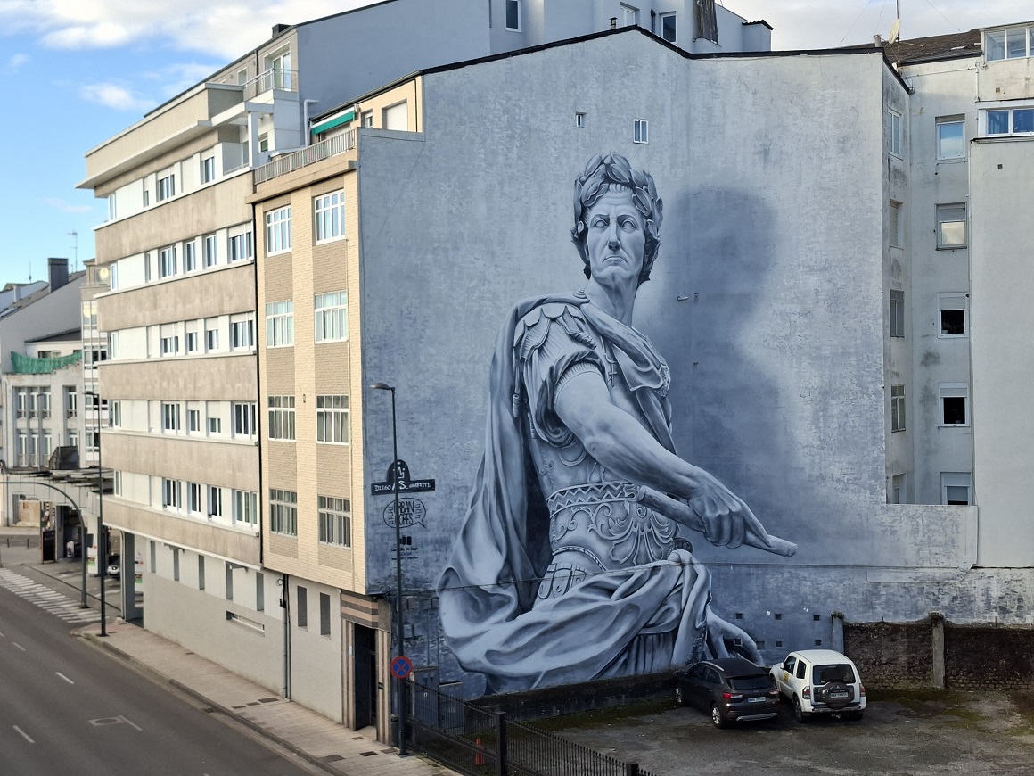 Sin duda, hacer el paseo de la muralla es de las mejores cosas que se pueden hacer en Lugo, especialmente si se hace pronto por la mañana o al atardecer. Tiene una longitud total de 2,1 km, y se hace tranquilamente en una hora o incluso algo menos. Aunque hay otras murallas romanas en Europa más grandiosas, como la de Roma o Estambul, al parecer esta es la única conservada de forma íntegra. Si queréis saber más sobre su historia, os recomiendo este video del divulgador de ingeniería romana Isaac Moreno Gallo sobre la muralla romana de Lugo. Abajo, un par de fotos durante el paseo, en las que se ve otro mural de arte urbano que representa a Julio César.