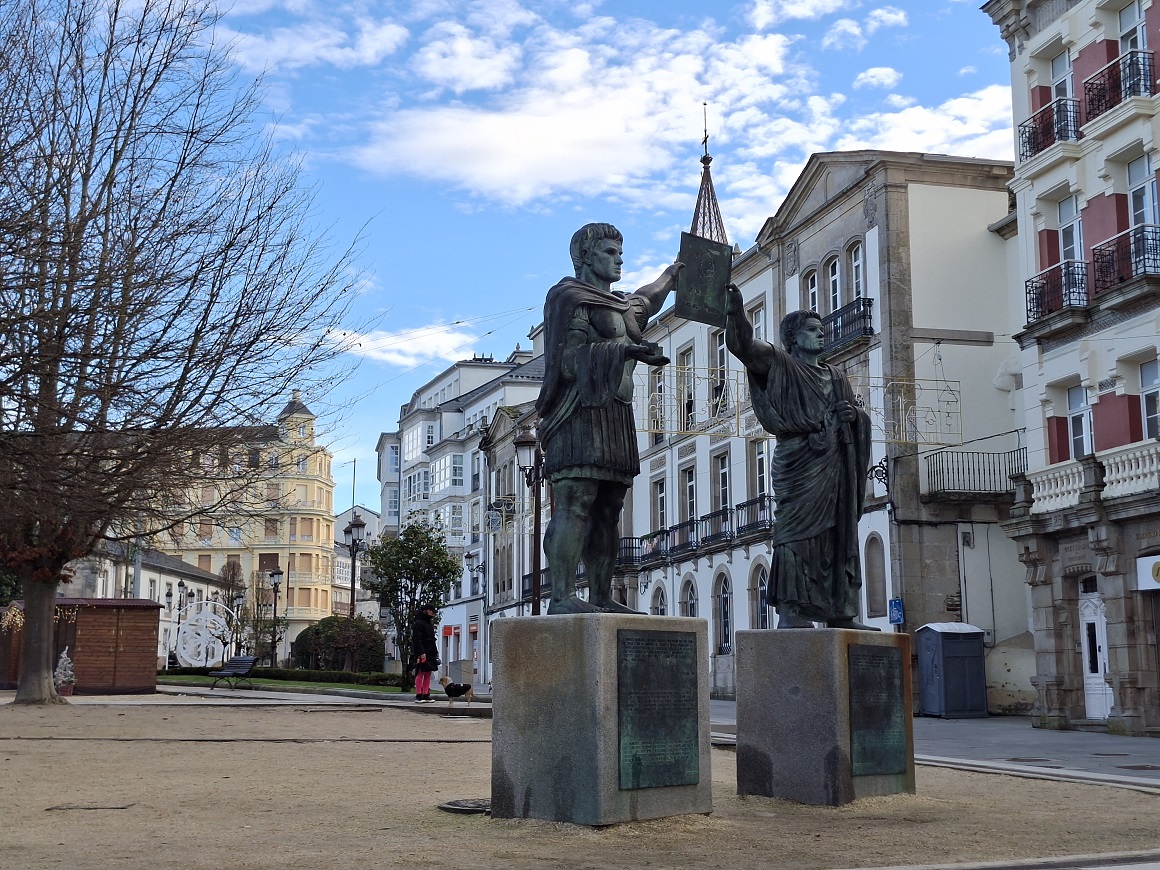 Al día siguiente, lo primero fue meternos un fabuloso desayuno en el hotel. Da gusto alojarse en hoteles de calidad, donde sabes que a la mañana siguiente te espera un maravilloso desayuno buffet. Había de todo, incluso zumo natural. Una fantástica manera de empezar el día. Desde el hotel, caminamos hasta el casco histórico, entrando por la misma puerta de la muralla que el día anterior (la del obispo Aguirre). Llegamos a la plaza mayor, y desde ahí fuimos hasta la catedral, rodeando para pasar de nuevo por la plaza del Campo. Aun era temprano, y las calles estaban muy vacias, se podían hacer buenas fotos. Abajo a la izquierda, esculturas de Augusto y Julio César que presiden la entrada a la plaza mayor.