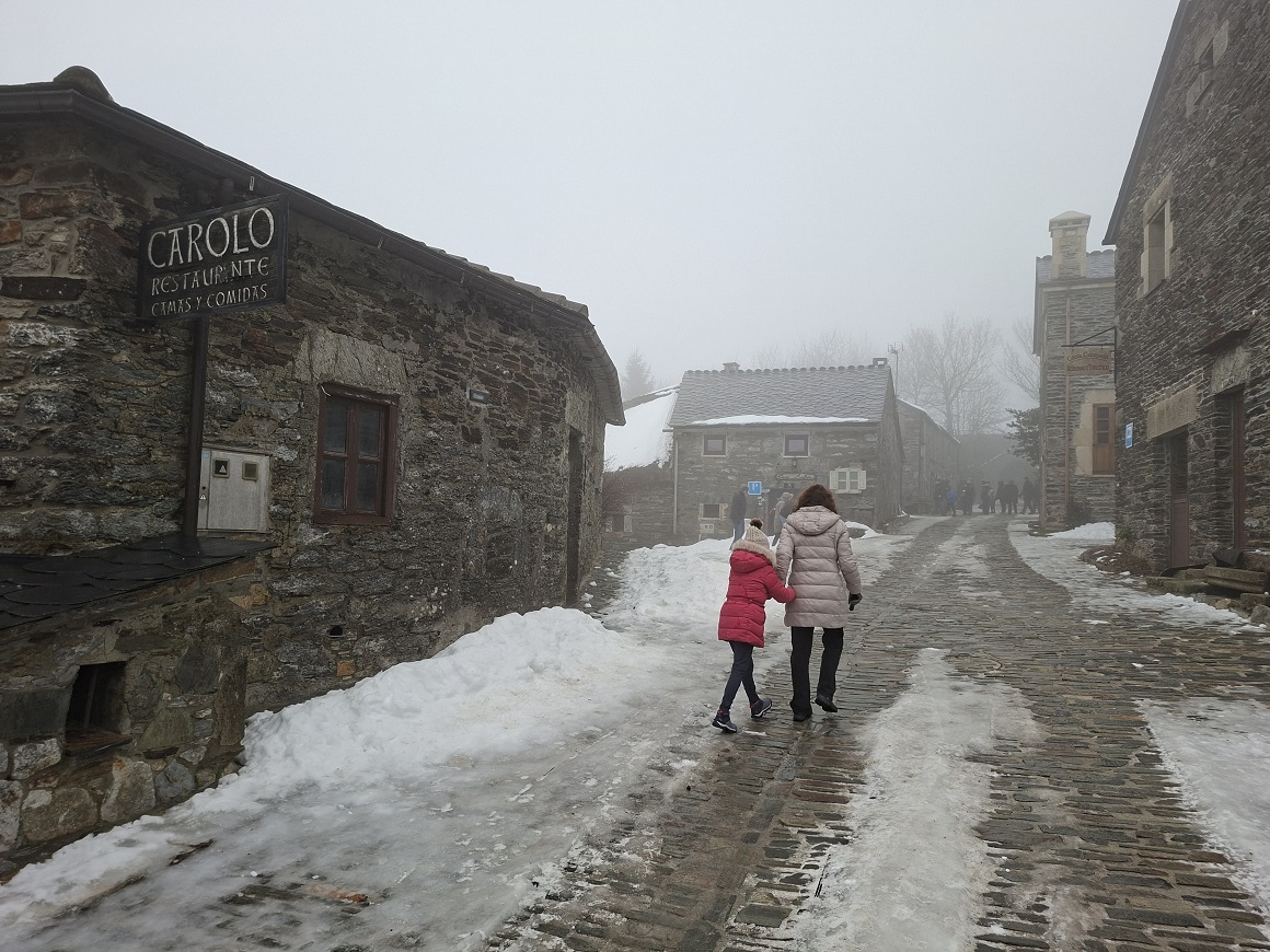 Está aún más alta que el puerto, así que siendo Diciembre, estaba todo lleno de nieve. Siempre es divertido poder disfutar un poco la nieve, ya que en Madrid cada vez la vemos menos, y además entre la nieve, la niebla y el frio, el paisaje realmente te transportaba a la época medieval en que los peregrinos recorrían estos caminos a pie, y paraban aquí en busca de cobijo, un fuego al que arrimarse, y algo de comida.