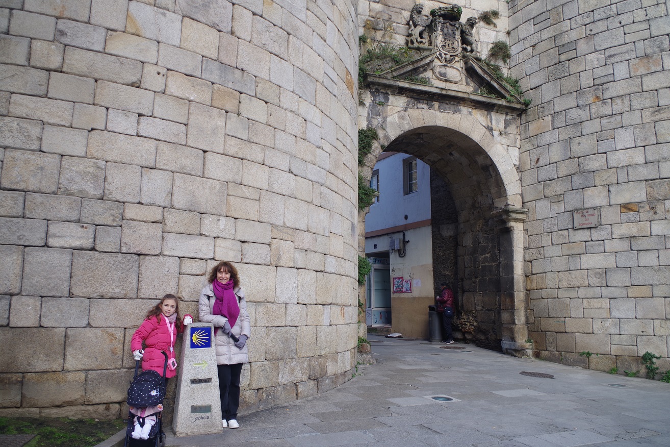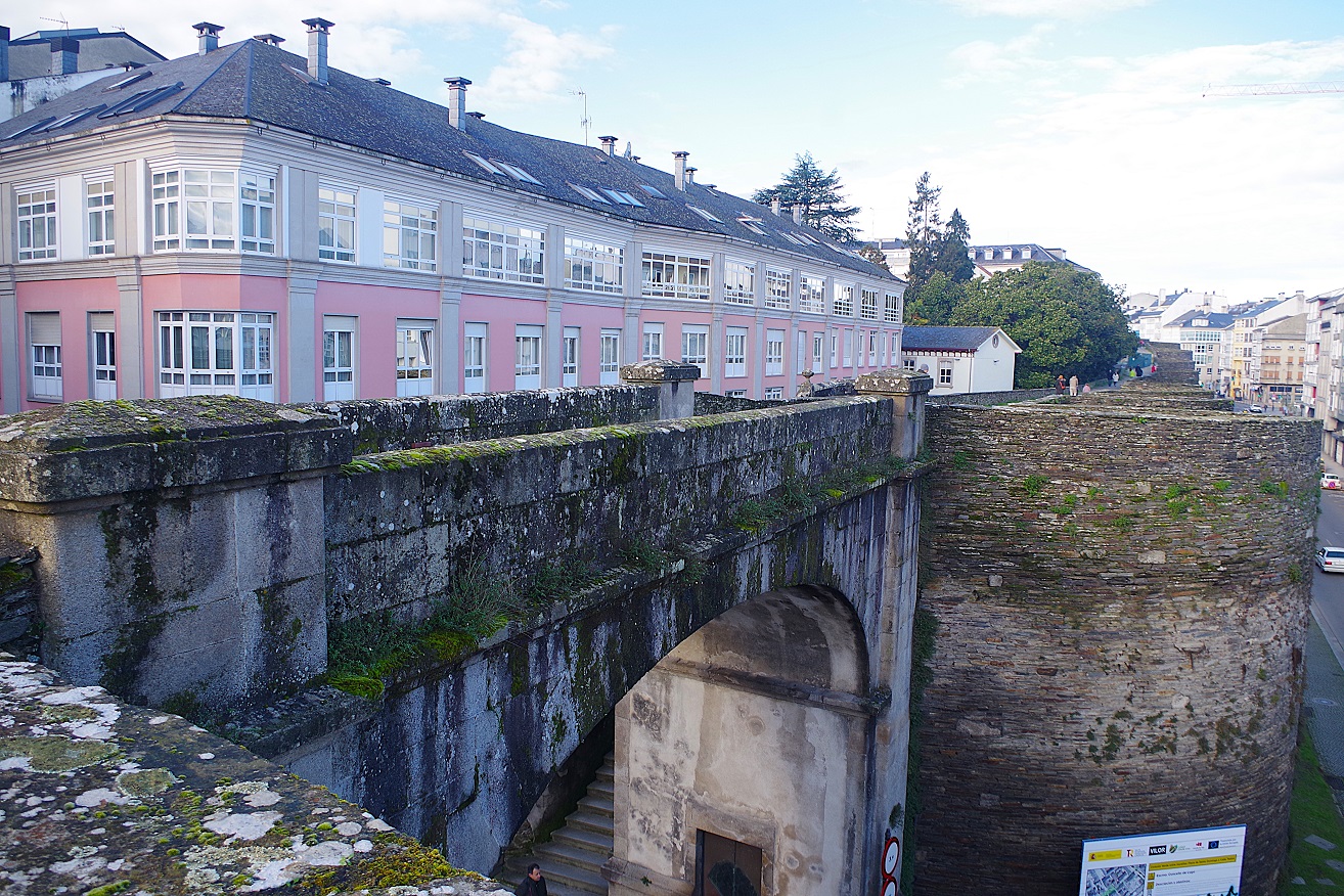 Arriba a la derecha, una de las puertas abiertas en el siglo XIX, la de la estación. Al llegar a la torre de A Mosqueira, la que conserva las dos ventanas, bajamos de la muralla. El tramo siguiente hasta la catedral ya lo habíamos hecho el día anterior por la tarde. La razón de bajar era para poder contemplar la puerta de San Pedro desde abajo, que es otra de las puertas originales romanas, aunque modificada y arreglada en siglos posteriores. Por aquí entra el camino de Santiago a la ciudad. Además, ese tramo de la muralla es de los más fotogénicos para verlo desde abajo.