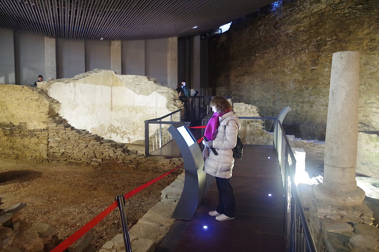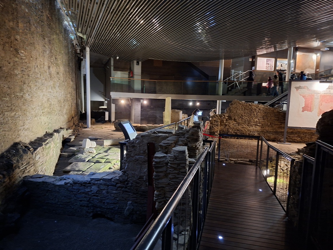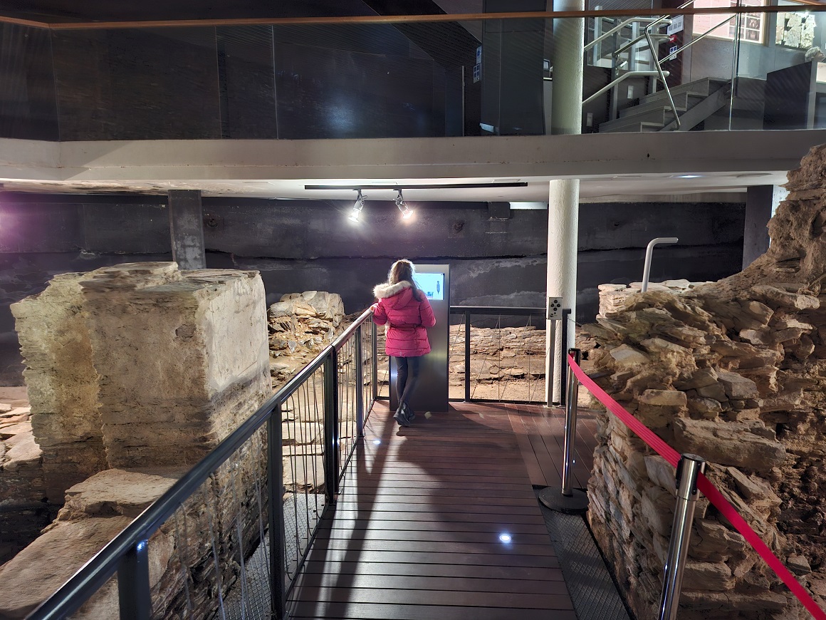 Y de nuevo junto a la catedral, justo donde empezamos nuestro paseo por la muralla, está el edificio de la casa del Mitreo, cuya entrada cuesta 3,3 euros para adultos, y gratis para Inés. Para más información sobre horarios, fotos, etc podéis consultar su web oficial aquí. Se trata de una antigua villa romana, propiedad de un centurión, que tenía una capilla familiar para venerar al dios Mitra, de origen persa pero muy conocido y venerado en el mundo romano (de ahí el nombre de casa del Mitreo).