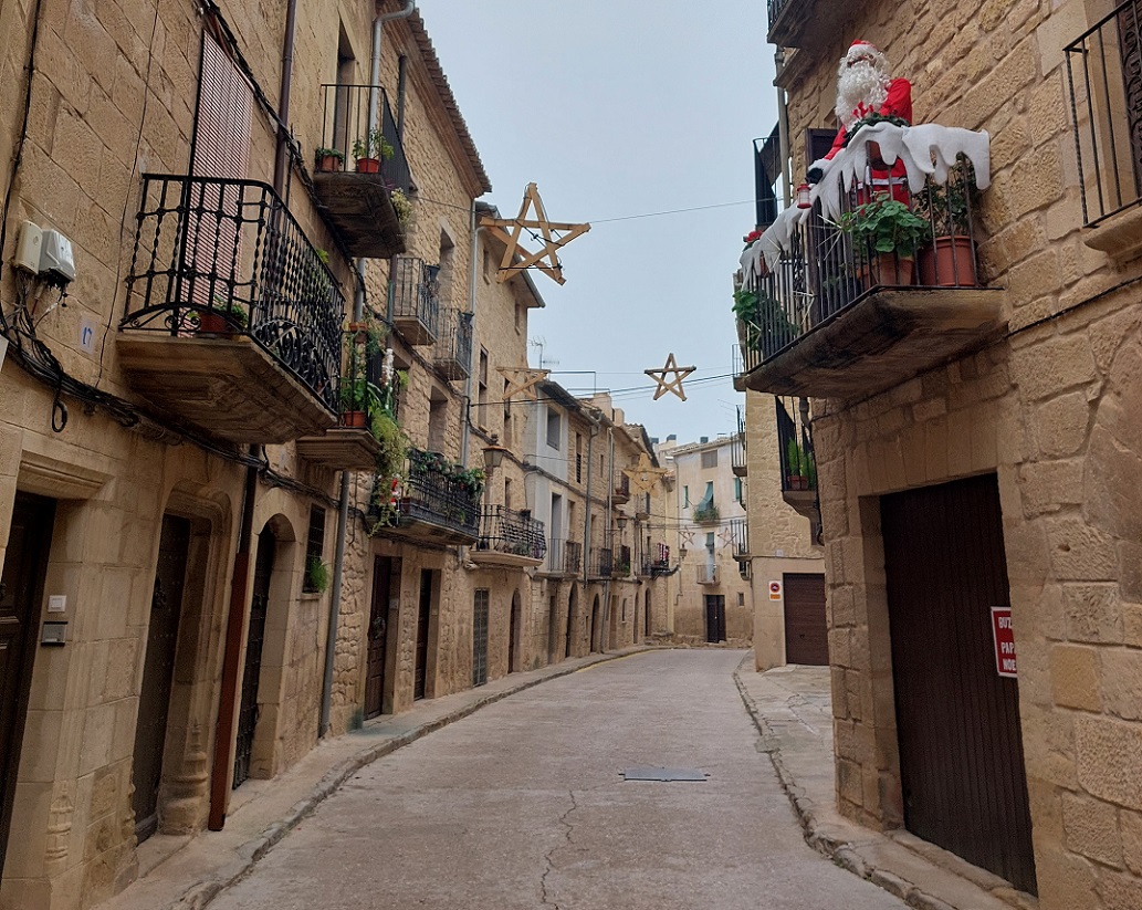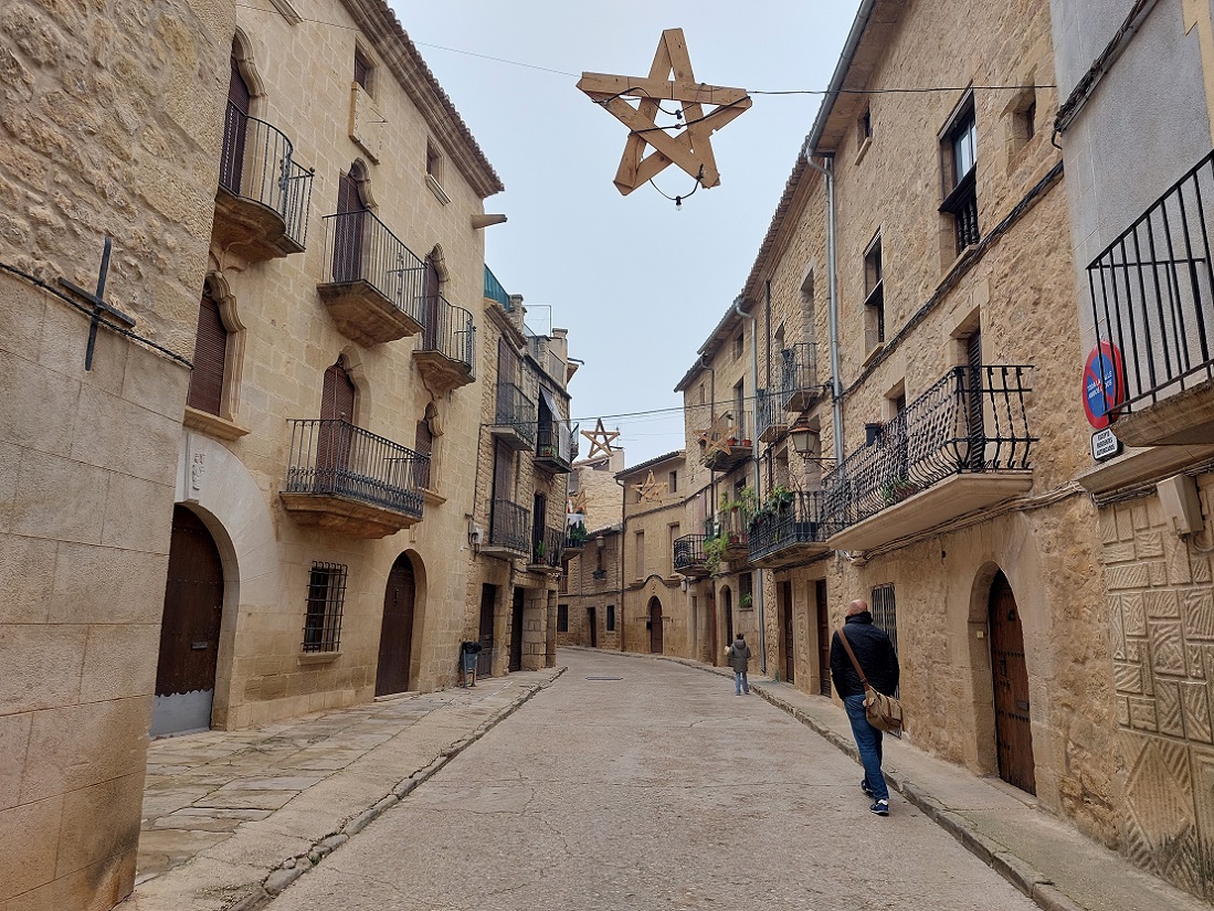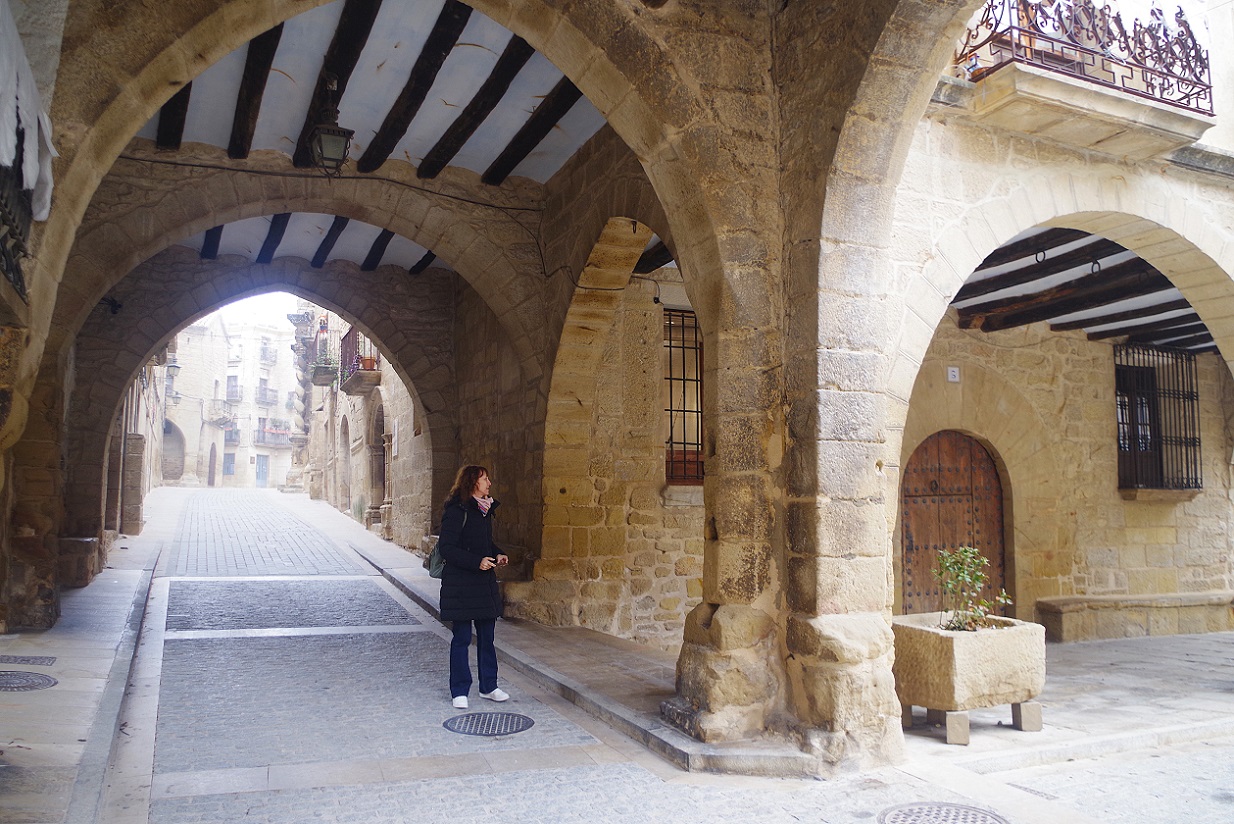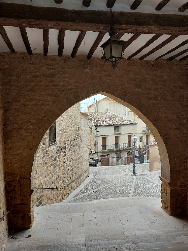 Con buen tiempo, aquí se montan varias terrazas que tienen que ser un sitio estupendo para tomar algo mientras uno observa el discurrir del rio. Y con el estómago caliente después de nuestro paso por la taberna, volvimos al coche. Hicimos tres cuartos de hora de ruta, casi todo en medio de una persistente niebla, hasta llegar a Calaceite, ya en la provincia de Teruel. Sabíamos, porque habíamos estado un par de años antes, que en la plaza mayor hay un restaurante estupendo, así que emprendimos el paseo por sus calles medievales, frías y solitarias, hasta dicha plaza.