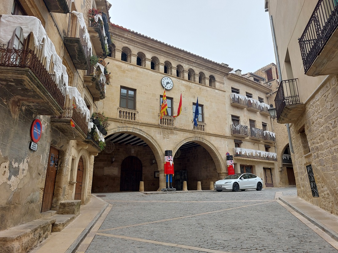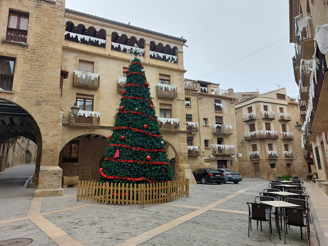 Y al llegar a la plaza... ahí lo tenemos, el restaurante, enfrente del bello edificio del ayuntamiento y del árbol de Navidad. Es como reencontrarse con un viejo amigo. Incluso tienen montada la terraza, aunque con este frio raro será que alguien se siente ahí (aunque es verdad que por estas tierras de Teruel están más que acostumbrados al frio). Preguntamos para comer, y nos dicen que tenemos que esperar un poco, así que aprovechamos para dar un paseo por las calles de alrededor. En este sitio, sobre todo si vais en época de mejor tiempo, es conveniente reservar. Es el restaurante del hotel del Sitjar.