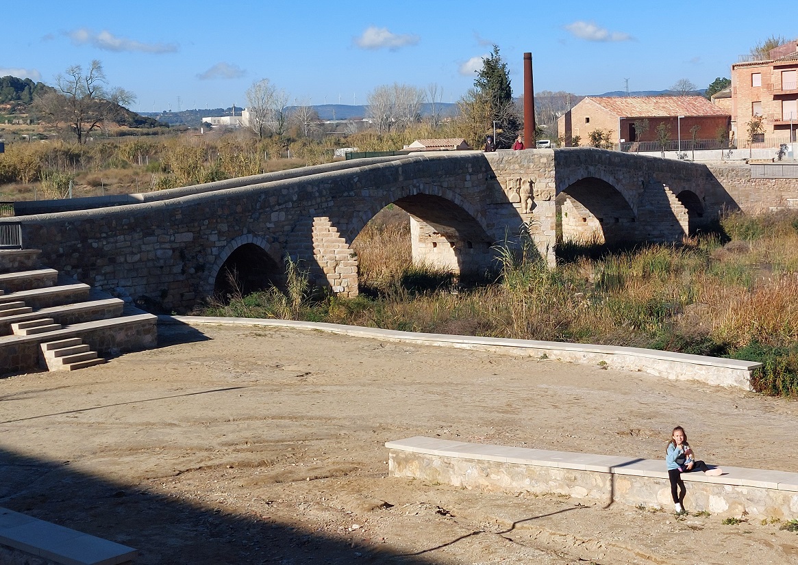 Al llegar al pueblo, aparcamos en un aparcamiento gratuito al lado de la muralla, y al lado también de un restaurante llamado "El molí del mallol". Estaba situado en un antiguo molino, y tenía muy buena pinta, así que decidimos comer allí. Pero antes, nos acercamos a ver el antiguo puente medieval que cruza el rio Francolí, y que estaba allí mismo, a 2 minutos caminando. Abajo podéis ver fotos en este puente, que debía ser en otros tiempos el principal punto de acceso a la ciudad.