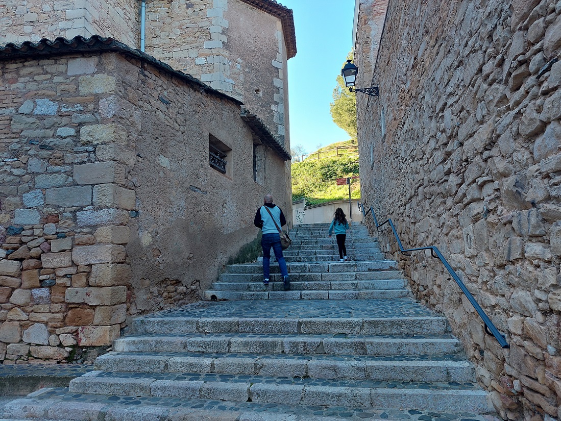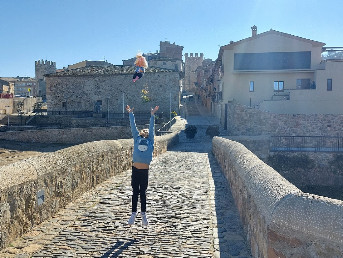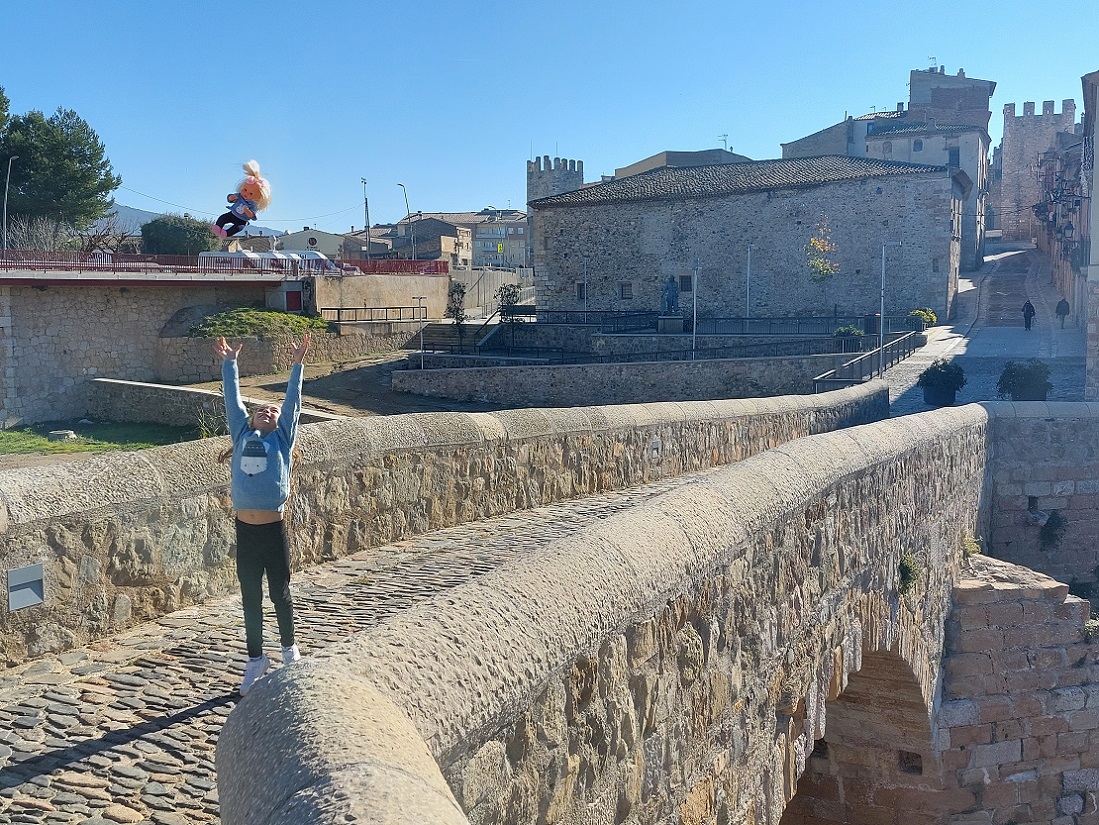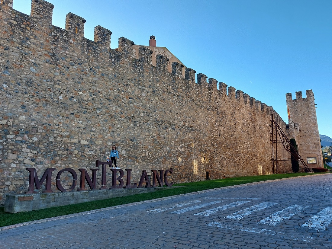 Y después de comer, ahora sí, nos encaminamos hacia la entrada principal de la muralla, que estaba a dos minutos del restaurante. Antes de entrar, Inés se hizo unas fotos con las letras del nombre del pueblo, un clásico en nuestros viajes. La muralla medieval de Montblanc es uno de los conjuntos fortificados mejor conservados de Cataluña. El rey Pedro el Ceremonioso (enterrado en el cercano monasterio de Poblet que habíamos visto por la mañana), ordenó construir las murallas hacia 1366, en plena guerra de los dos Pedros (entre la Corona de Aragón y Castilla). Tenía unos 30 torreones, de los que quedan 25 en pie.