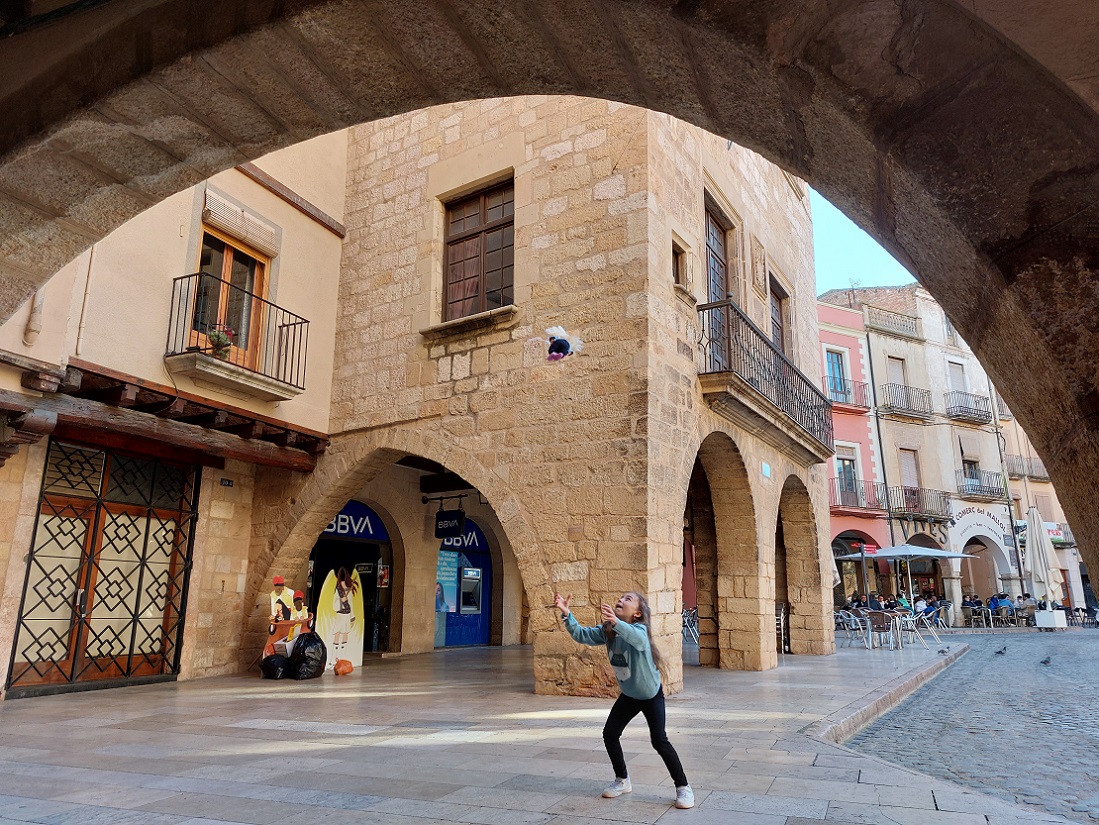 Estuvimos allí un rato, disfrutando de las vistas, y el silencio, porque estábamos solos, no había nadie más. En la ladera de esa colina, hay una zona infantil con columpios donde estuvimos también un rato, mientras Inés jugaba en los columpios, y con los gatos que por allí andaban. Luego, bajamos hasta la iglesia de Santa María, que la habíamos visto desde arriba y la teníamos al lado. Abajo podéis ver fotos de esta iglesia, esta es sin duda la zona más bonita de Montblanc.