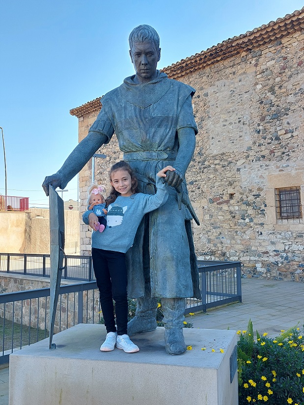 Arriba a la izquierda, en la foto podéis ver al fondo unos vehículos aparcados, y detrás el edificio del restaurante. Allí es donde habíamos aparcado. En la foto de la derecha, junto a uno de los extremos del puente hay una escultura de Sant Jordi fundida en bronce. Este santo es el patrón de Cataluña, y tiene asociada una leyenda con el pueblo de Montblanc.
