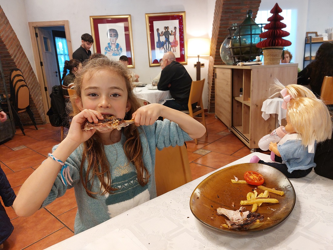 Desde el extremo del puente en el que estábamos sale una calle muy bonita que lleva directamente hasta la puerta principal de acceso de la muralla de Montblanc (foto de abajo a la izquierda). No fuimos por ahí, porque teníamos que comer primero, así que fuimos al restaurante de El Molí del Mallol, donde comimos realmente fenomenal. No tenéis más que ver a Inés en la foto de la derecha como devora su ración de cochinillo. Un sitio totalmente recomendable. La verdad es que en este viaje por la provincia de Tarragona, estábamos comiendo muy bien.