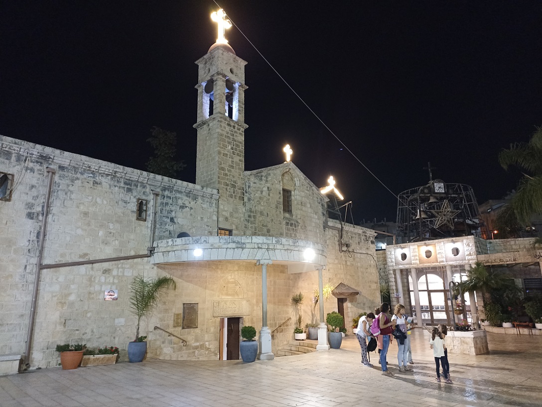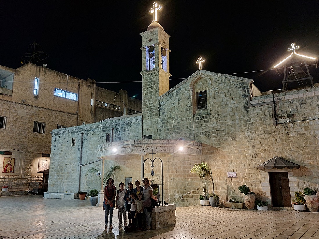 Ya era de noche cuando salimos. Nuestro hotel estaba muy cerca de la iglesia ortodoxa de la Anunciación, a unos pasos. Hacia allí fuimos para verla de noche, al menos el exterior. Ya estaba cerrada, al día siguiente la veríamos por dentro. Abajo, unas fotos en la plaza junto a esta iglesia, una de las dos más importantes que hay en Nazaret.