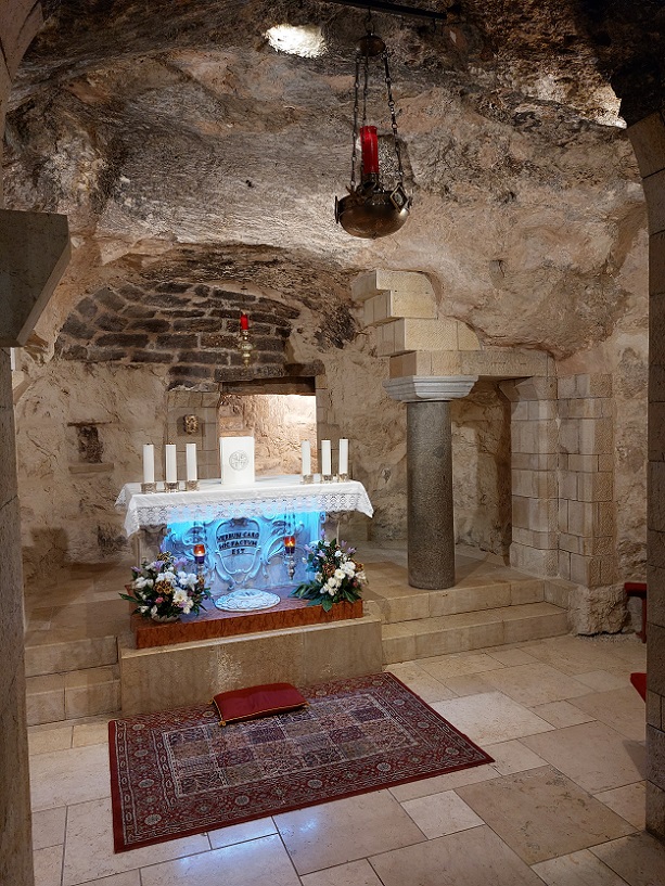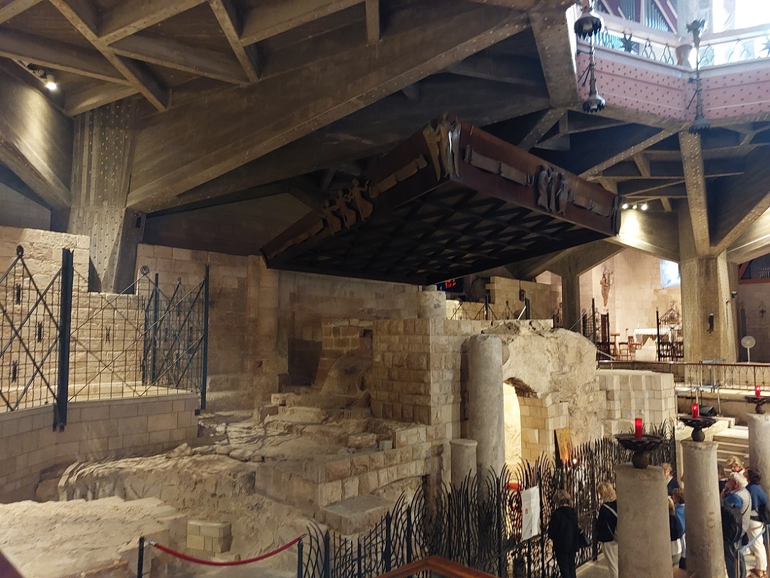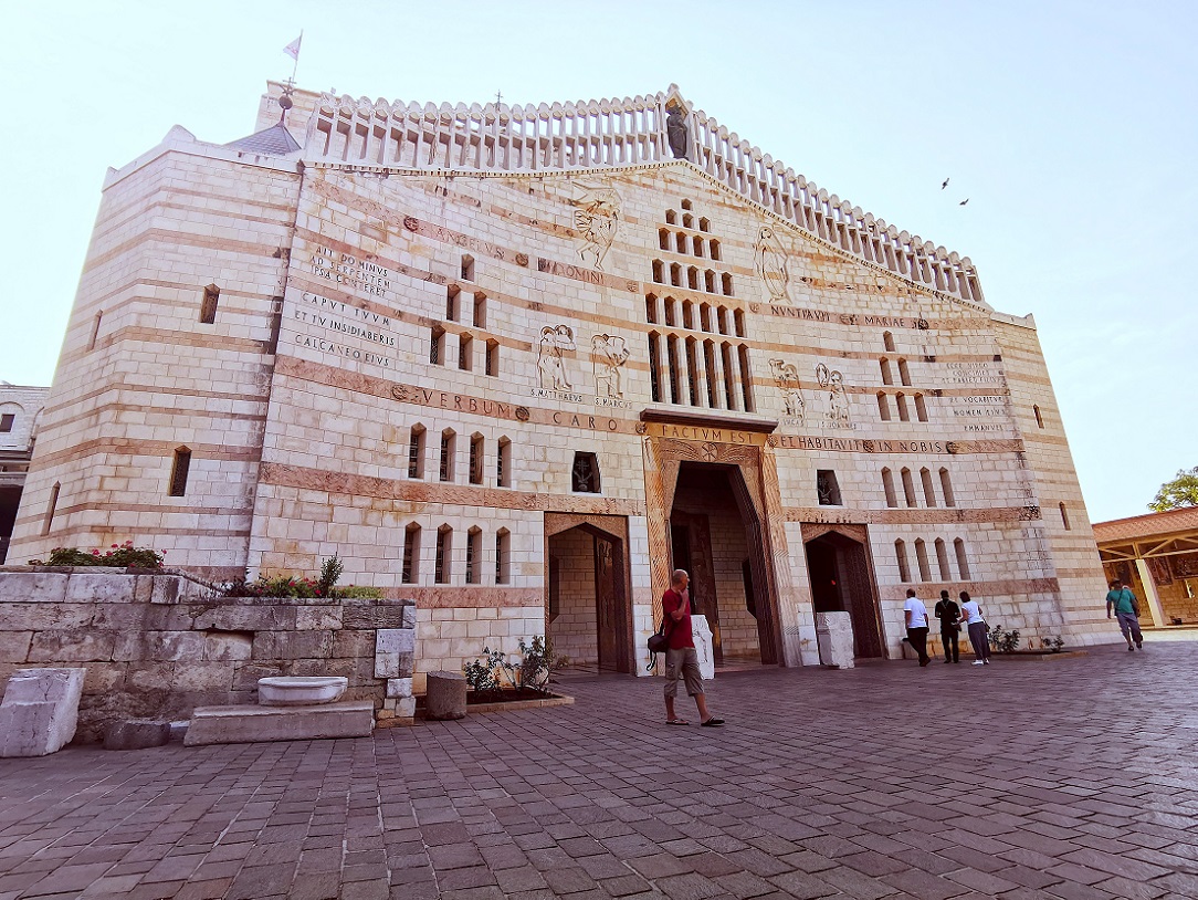 Esta gran basílica (es la iglesia cristiana más grande de Oriente Medio) fue construída en 1969. En el interior, se ha conservado la gruta que fue la vivienda original de la familia de María (foto de abajo a la derecha). En el siglo I, gran parte de las casas de la ciudad estaban excavadas en la blanda roca caliza de la zona. Eso se puede ver en las excavaciones arqueológicas que se hicieron al construír la basílica, y que se han dejado a la vista, donde se pueden ver restos de otras viviendas (foto de abajo a la izquierda).