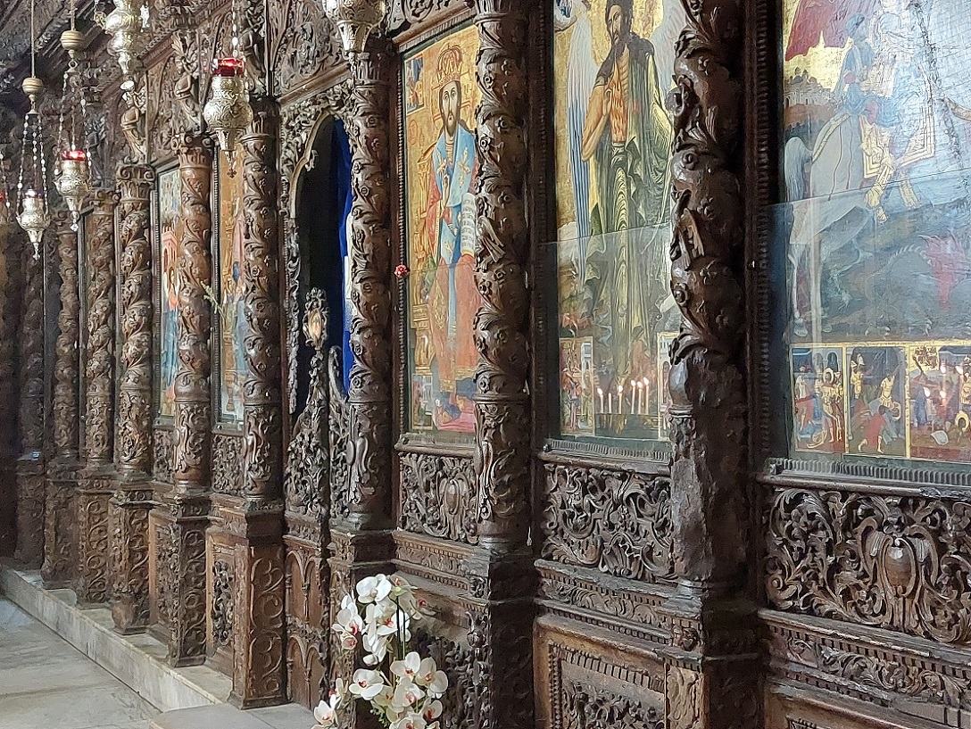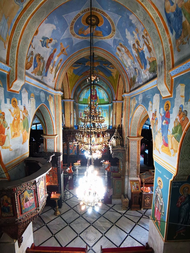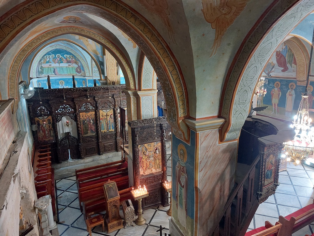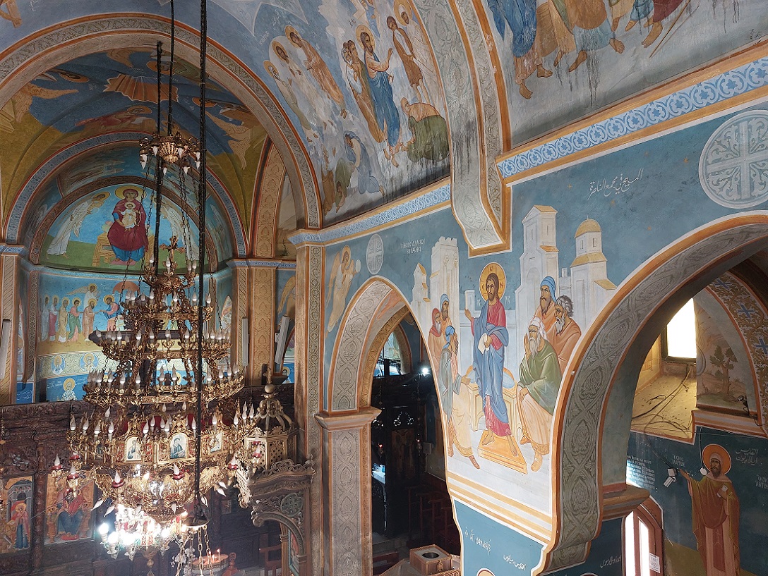 La iglesia actual fue construída alrededor de 1750 por la comunidad greco-ortodoxa, con el apoyo de los otomanos. Abajo, fotos en el interior de la iglesia, que está muy decorada con todo tipo de tallas e iconos.