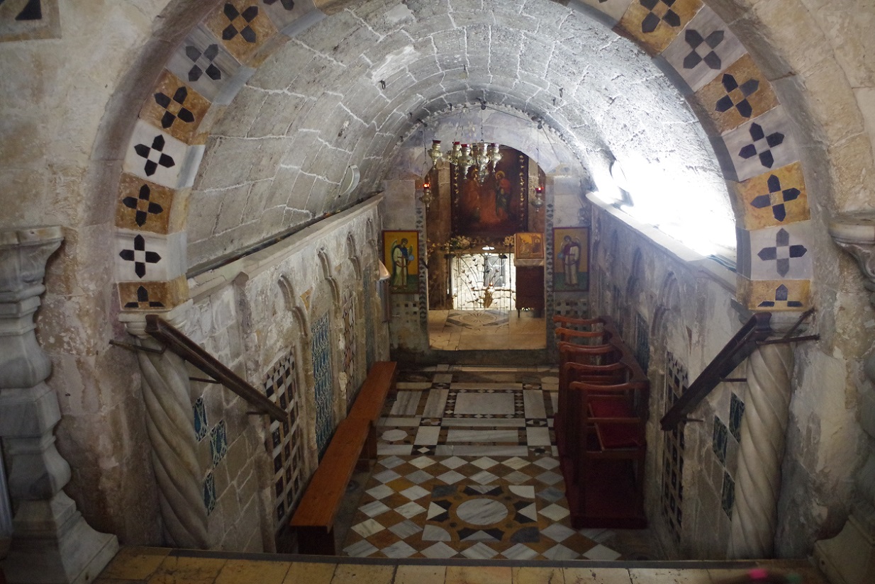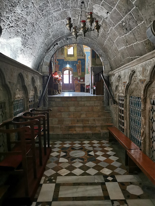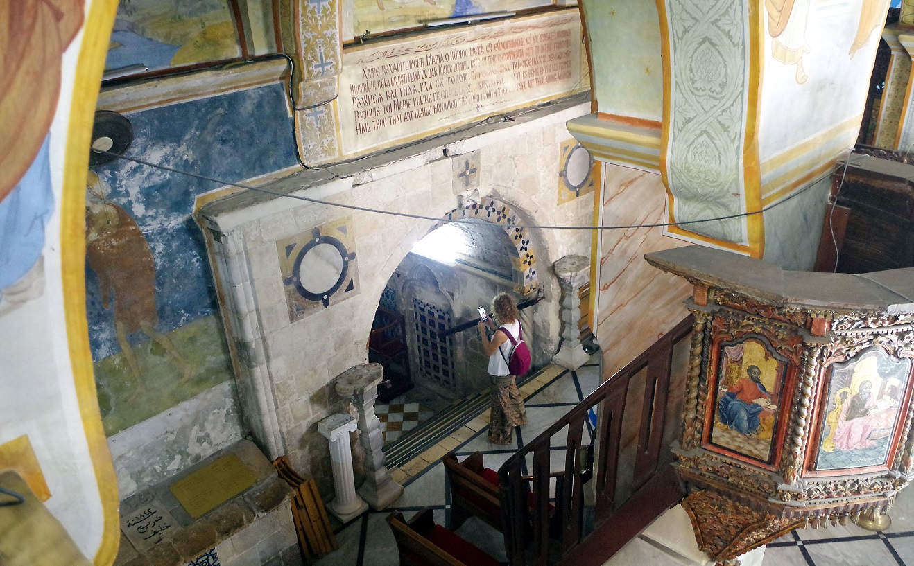 Ya desde antiguo, en época bizantina (siglo IV o V) se construyó una iglesia sobre el manantial. De esa primitiva iglesia no queda nada. Después, en la época de las cruzadas, en el siglo XII, se contruyó una iglesia mayor (al igual que se hizo en la basílica católica que habíamos visto antes). Esa iglesia también fue destruída, pero de esa sí que quedan restos, en concreto la maravillosa cripta del manantial que se puede ver en su interior.