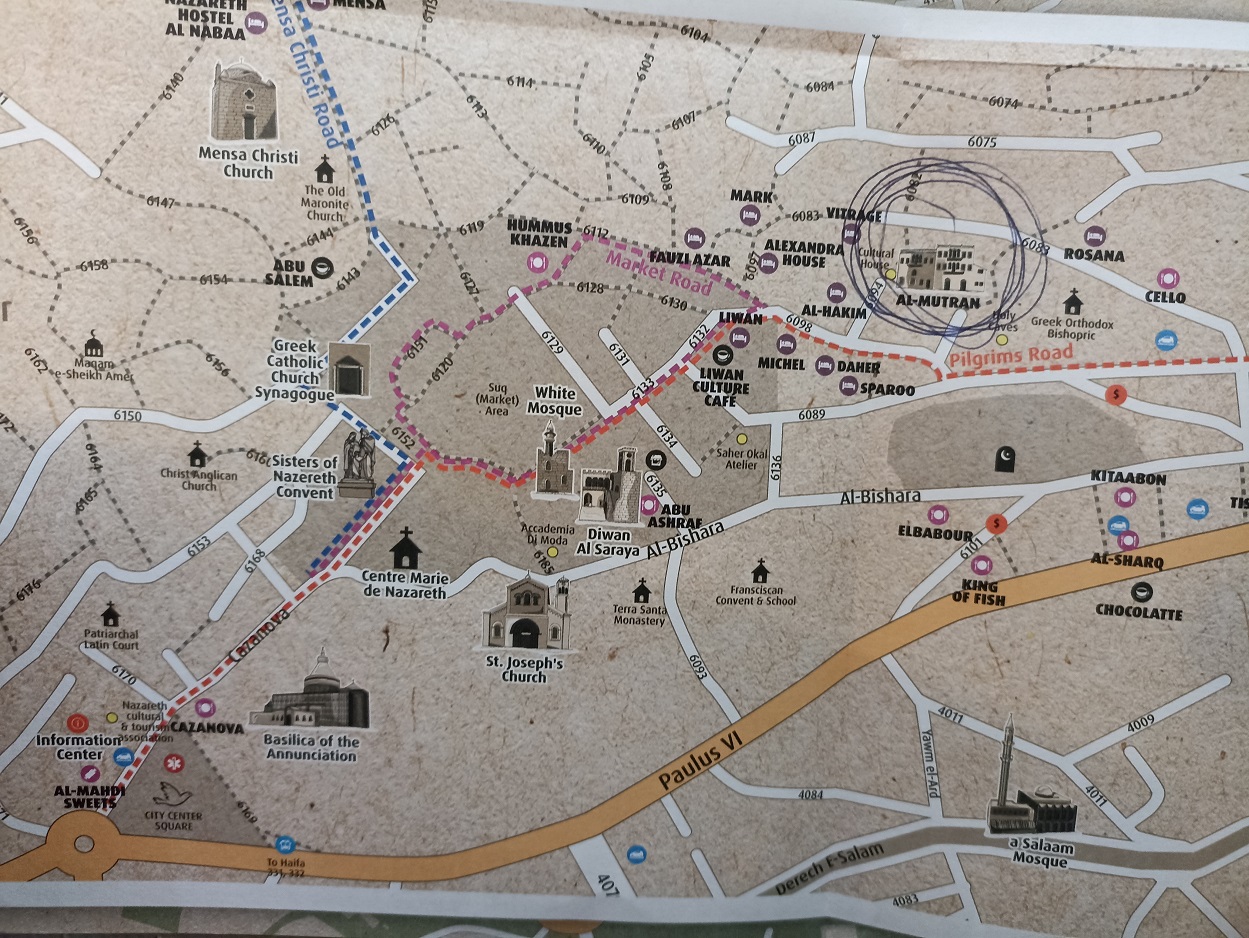 Abajo podéis ver un plano donde se ven las dos iglesias, y junto a la ortodoxa, nuestro alojamiento (rodeado con un círculo), llamado Al-Mutran. Después del paseo, a dormir que al día siguiente tocaba madrugar.