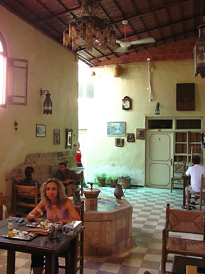 Nuestro último desayuno en ese hostal barato de Damasco que tanto encanto tenía. Abajo a la izquierda podéis ver una foto en la sala donde servían el desayuno. El día anterior lo pasamos entero haciendo una excursión a los formidables templos de Baalbek, en Líbano. Después del desayuno, recogimos nuestro equipaje y cogimos un taxi a la estación de autobuses, donde nos montamos en el que iba hacia Tudmur, el pueblo en el que están las ruinas de Palmira.